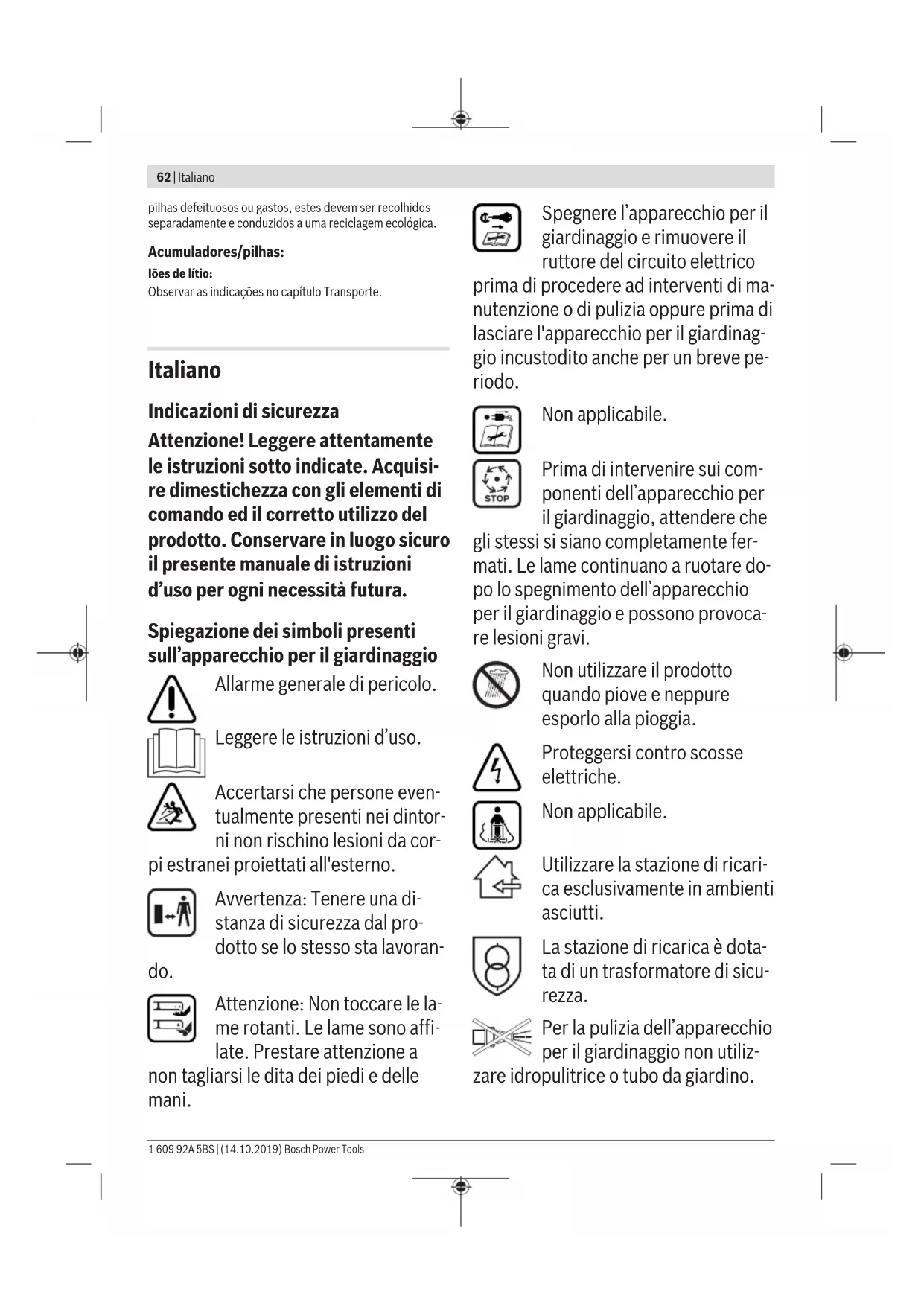 Para aumentar o tempo de funcionamento, pode ser adquirido um acumulador adicional num centro de serviço pós-venda autorizado para aparelhos de jardinagem Bosch. Busca de erros Sintoma Possível causa Solução O motor não arranca A cablagem interna do aparelho de jardinagem está com defeito Entre em contacto com o serviço de atendimento ao cliente Bosch Descarregar o acumulador Carregar o acumulador Acumulador frio/quente demais Permitir que o acumulador se aqueça/arrefeça Relva longa demais A máx. altura admissível da grama é de 30 cm com o maior ajuste da altura de corte A proteção do motor foi ativada Deixar o motor arrefecer e aumentar a altura de corte O disjuntor do circuito elétrico não foi introduzido de forma correta/completamente Colocar de forma correta O aparelho de jardinagem funciona com interrupções A cablagem interna do aparelho de jardinagem está com defeito Entre em contacto com o serviço de atendimento ao cliente Bosch A proteção do motor foi ativada Deixar o motor arrefecer e aumentar a altura de corte O aparelho de jardinagem produz um resultado de corte irregular e/ou o motor funciona com dificuldade Altura de corte pequena demais Aumentar a altura de corte As lâminas estão embotadas Trocar as lâminas (veja figura K) É possível que haja uma obstrução Desligar o aparelho de jardinagem e soltar o disjuntor de circuito elétrico Controlar o lado de baixo do aparelho de jardinagem e eliminar a obstrução, se for necessário (use sempre luvas para jardinagem) Lâmina montada do lado errado Montar a lâmina do lado certo Após ligar o aparelho de jardinagem, a lâmina de corte não gira A lâmina é impedida pela relva Desligar o aparelho de jardinagem e soltar o disjuntor de circuito elétrico Remover a obstrução (sempre usar luvas para jardinagem) Porca/parafuso da lâmina soltos Apertar porca/parafuso da lâmina (27Nm) Fortes vibrações/ ruídos Porca/parafuso da lâmina soltos Apertar porca/parafuso da lâmina (27Nm) Lâmina danificada Trocar as lâminas (veja figura K) Acumulador e carregador 1 609 92A 5BS | (14.10.2019) Bosch Power ToolsPortuguês | 61 Sintomas Possível causa Solução Indicação vermelha da carga do acumulador pisca no carregador Nenhum processo de carga possível Acumulador não inserido (corretamente) Inserir o acumulador corretamente no carregador Contactos do acumulador sujos Limpar os contactos do acumulador, p.ex. colocando e retirando repetidamente o acumulador, se necessário substituir o acumulador Acumulador danificado Substituir o acumulador As indicações de carga dos acumuladores não se iluminam no carregador A ficha de rede do carregador não está (corretamente) introduzida Introduzir a ficha de rede (totalmente) na tomada Tomada, cabo de rede ou carregador com defeito Controlar a tensão de rede, se necessário, permitir que o carregador seja controlado por uma oficina de serviço autorizada para ferramentas elétricas Bosch Manutenção e serviço Tratamento do acumulador u Atenção! Desligar o aparelho de jardinagem, soltar o disjuntor de corrente elétrica e remover o acumulador e o cesto de recolha de relva antes de executar trabalhos de manutenção e de limpeza. u Sempre usar luvas de jardinagem se estiver a trabalhar na área das lâminas afiadas. Para assegurar a utilização otimizada do acumulador, deverá observar as seguintes indicações e medidas: – Proteger o acumulador contra humidade e água. – Só armazenar o aparelho de jardinagem e o acumulador numa faixa de temperatura entre -20 °C e 50 °C. Por exemplo, durante o verão, não se deve deixar o aparelho de jardinagem no carro. – Armazenar o acumulador separadamente e não no aparelho de jardinagem. – Não deixe o acumulador dentro do aparelho de jardinagem, em caso de radiação solar direta. – A temperatura ideal para a arrecadação do acumulador é de 5°C. – Limpar de vez em quando as aberturas de ventilação do acumulador com um pincel macio, limpo e seco. Um período de funcionamento reduzido após o carregamento, indica que o acumulador está gasto e que deve ser substituído. Serviço pós-venda e aconselhamento www.bosch-garden.com Indique para todas as questões e encomendas de peças sobressalentes a referência de 10dígitos de acordo com a placa de caraterísticas do produto. Portugal Robert Bosch LDA Avenida Infante D. Henrique Lotes 2E – 3E 1800 Lisboa Para efetuar o seu pedido online de peças entre na página www.ferramentasbosch.com. Tel.: 21 8500000 Fax: 21 8511096 Brasil Robert Bosch Ltda. – Divisão de Ferramentas Elétricas Rodovia Anhanguera, Km 98 - Parque Via Norte 13065-900, CP 1195 Campinas, São Paulo Tel.: 0800 7045 446 www.bosch.com.br/contato Transporte Os acumuladores de iões de lítio, contidos, estão sujeitos ao direito de materiais perigosos. Os acumuladores podem ser transportados na rua pelo utilizador, sem mais obrigações. Ao ser enviado por terceiros (por. ex.: transporte aéreo ou expedição) devem ser observados os requerimentos especiais quanto à embalagem e identificação. Neste caso é necessário consultar um especialista de materiais perigosos ao preparar a peça a ser trabalhada. Acumuladores só devem ser transportados se a carcaça estiver em perfeito estado. Colar contactos abertos e embalar o acumulador de modo que não possa se movimentar dentro da embalagem. Respeite também outras disposições nacionais eventualmente existentes. Eliminação Os aparelhos de jardim, os acessórios e as embalagens devem ser enviados a uma reciclagem ecológica de matéria-prima. Não deitar os aparelhos de jardinagem e acumuladores/pilhas no lixo doméstico! Apenas paísesda União Europeia: Conforme as Diretivas Europeias 2012/19/UE relativa aos resíduos aparelhos elétricos e eletrónicos velhos e conforme a diretiva europeia 2006/66/CE relativa a acumuladores/ Bosch Power Tools 1 609 92A 5BS | (14.10.2019)62 | Italiano pilhas defeituosos ou gastos, estes devem se