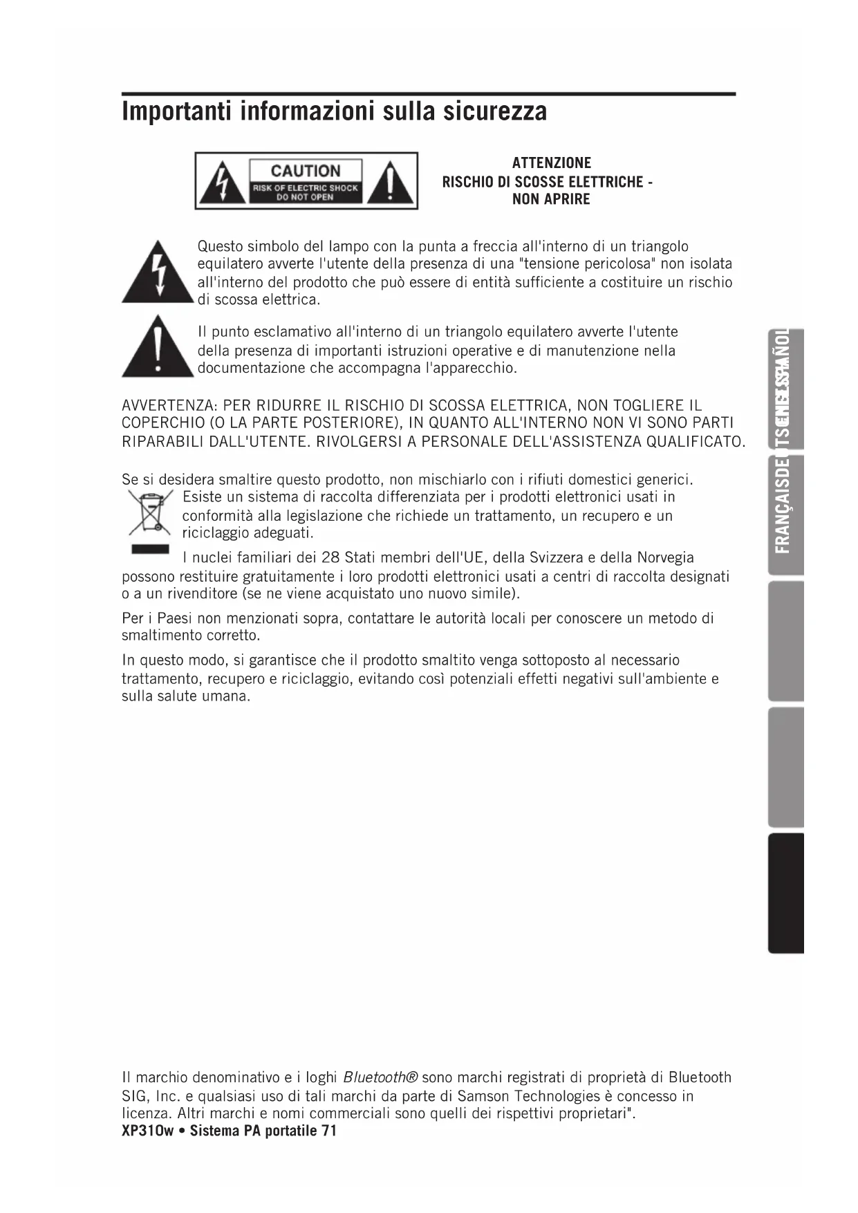 NON APRIRE Questo simbolo del lampo con la punta a freccia all'interno di un triangolo equilatero avverte l'utente della presenza di una "tensione pericolosa" non isolata all'interno del prodotto che può essere di entità sufficiente a costituire un rischio di scossa elettrica. Il punto esclamativo all'interno di un triangolo equilatero avverte l'utente della presenza di importanti istruzioni operative e di manutenzione nella documentazione che accompagna l'apparecchio. AVVERTENZA: PER RIDURRE IL RISCHIO DI SCOSSA ELETTRICA, NON TOGLIERE IL COPERCHIO (O LA PARTE POSTERIORE), IN QUANTO ALL'INTERNO NON VI SONO PARTI RIPARABILI DALL'UTENTE. RIVOLGERSI A PERSONALE DELL'ASSISTENZA QUALIFICATO. Se si desidera smaltire questo prodotto, non mischiarlo con i rifiuti domestici generici. Esiste un sistema di raccolta differenziata per i prodotti elettronici usati in conformità alla legislazione che richiede un trattamento, un recupero e un riciclaggio adeguati. I nuclei familiari dei 28 Stati membri dell'UE, della Svizzera e della Norvegia possono restituire gratuitamente i loro prodotti elettronici usati a centri di raccolta designati o a un rivenditore (se ne viene acquistato uno nuovo simile). Per i Paesi non menzionati sopra, contattare le autorità locali per conoscere un metodo di smaltimento corretto. In questo modo, si garantisce che il prodotto smaltito venga sottoposto al necessario trattamento, recupero e riciclaggio, evitando così potenziali effetti negativi sull'ambiente e sulla salute umana. Importanti informazioni sulla sicurezza Il marchio denominativo e i loghi Bluetooth® sono marchi registrati di proprietà di Bluetooth SIG, Inc. e qualsiasi uso di tali marchi da parte di Samson Technologies è concesso in licenza. Altri marchi e nomi commerciali sono quelli dei rispettivi proprietari".72 Importanti informazioni sulla sicurezza