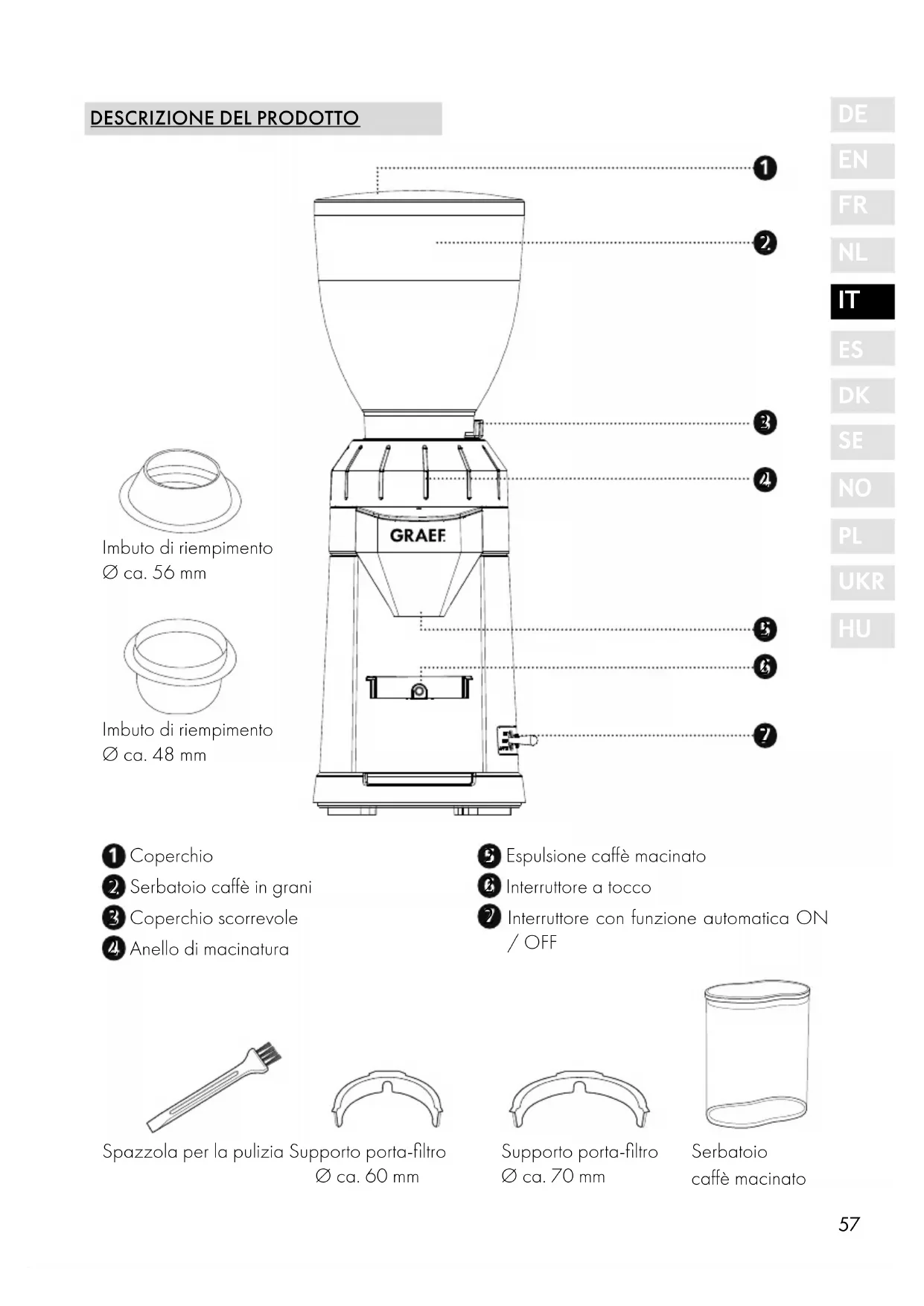 Spazzola per la pulizia Supporto porta-filtro Ø ca. 60 mm Supporto porta-filtro Ø ca. 70 mm Serbatoio caffè macinato Imbuto di riempimento Ø ca. 56 mm Imbuto di riempimento Ø ca. 48 mm58 PREFAZIONE Gentile Cliente, Acquistando questo macinacaffè avete fatto un'ottima scelta. Ha acquistato un prodotto di qualità comprovata. Vi ringraziamo e vi auguriamo molta soddisfazione nell'uso del vostro macinacaffè Graef. INFORMAZIONI RELATIVE A QUESTE ISTRUZIONI PER L'USO Queste istruzioni per l'uso sono parte integrante del macinacaffè (di seguito denominato di- spositivo) e contengono importanti indicazioni per la messa in funzione, la sicurezza, l'uso conforme e la cura dello stesso. Le istruzioni per l'uso devono essere sempre disponibili presso il dispositivo. Devono essere lette e rispettate da chiunque sia incaricato con la: ● Messa in servizio, ● Gestione, ● Risoluzione di disfunzioni e/o la ● Pulizia Conservare queste istruzioni per l'uso e consegnatele al successivo proprietario assieme al dispositivo stesso. Queste istruzioni d’uso non possono coprire tutti gli aspetti possibili ed immaginabili. Per mag- giori informazioni o per problemi, non o non esaurientemente trattati nel presente manuale, rivolgersi al servizio assistenza clienti di Graef o a un suo rivenditore.