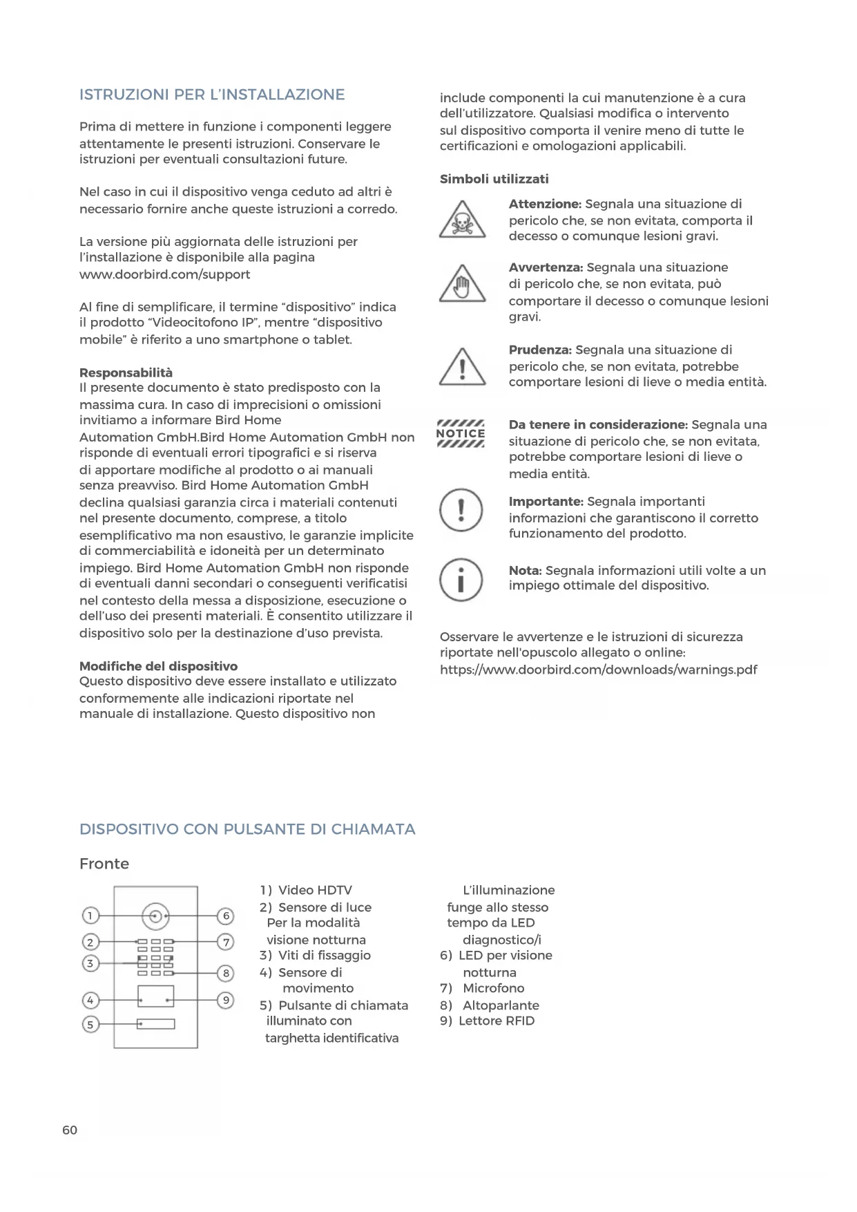 Prima di mettere in funzione i componenti leggere attentamente le presenti istruzioni. Conservare le istruzioni per eventuali consultazioni future. Nel caso in cui il dispositivo venga ceduto ad altri è necessario fornire anche queste istruzioni a corredo. La versione più aggiornata delle istruzioni per l’installazione è disponibile alla pagina www.doorbird.com/support Al fine di semplificare, il termine “dispositivo” indica il prodotto “Videocitofono IP”, mentre “dispositivo mobile” è riferito a uno smartphone o tablet. Responsabilità Il presente documento è stato predisposto con la massima cura. In caso di imprecisioni o omissioni invitiamo a informare Bird Home Automation GmbH.Bird Home Automation GmbH non risponde di eventuali errori tipografici e si riserva di apportare modifiche al prodotto o ai manuali senza preavviso. Bird Home Automation GmbH declina qualsiasi garanzia circa i materiali contenuti nel presente documento, comprese, a titolo esemplificativo ma non esaustivo, le garanzie implicite di commerciabilità e idoneità per un determinato impiego. Bird Home Automation GmbH non risponde di eventuali danni secondari o conseguenti verificatisi nel contesto della messa a disposizione, esecuzione o dell’uso dei presenti materiali. È consentito utilizzare il dispositivo solo per la destinazione d’uso prevista. Modifiche del dispositivo Questo dispositivo deve essere installato e utilizzato conformemente alle indicazioni riportate nel manuale di installazione. Questo dispositivo non Da tenere in considerazione: Segnala una situazione di pericolo che, se non evitata, potrebbe comportare lesioni di lieve o media entità. Nota: Segnala informazioni utili volte a un impiego ottimale del dispositivo. Importante: Segnala importanti informazioni che garantiscono il corretto funzionamento del prodotto. Attenzione: Segnala una situazione di pericolo che, se non evitata, comporta il decesso o comunque lesioni gravi. Avvertenza: Segnala una situazione di pericolo che, se non evitata, può comportare il decesso o comunque lesioni gravi. Prudenza: Segnala una situazione di pericolo che, se non evitata, potrebbe comportare lesioni di lieve o media entità. NOTICE include componenti la cui manutenzione è a cura dell’utilizzatore. Qualsiasi modifica o intervento sul dispositivo comporta il venire meno di tutte le certificazioni e omologazioni applicabili. Simboli utilizzati