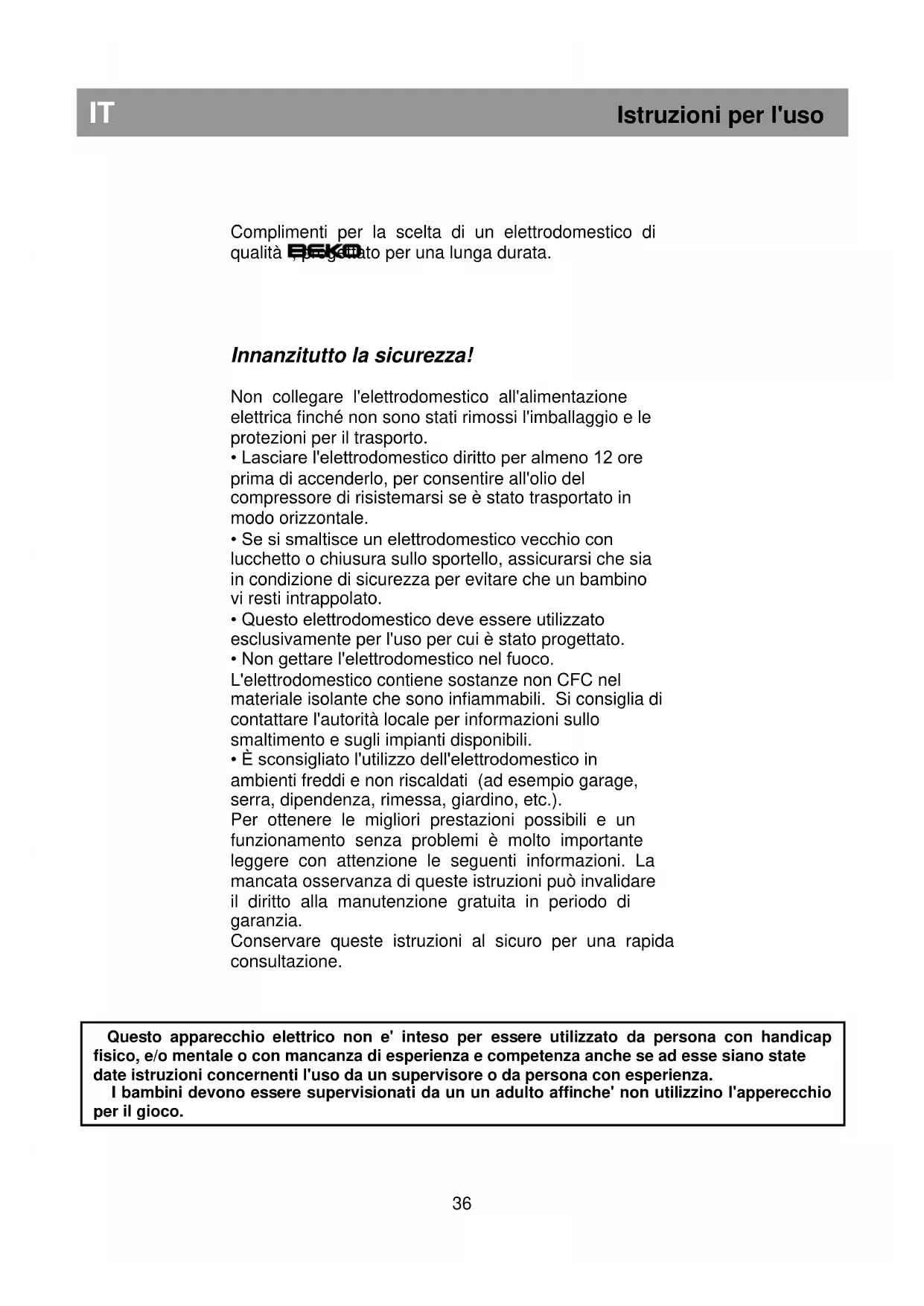 Questo apparecchio elettrico non e' inteso per essere utilizzato da persona con handicap fisico, e/o mentale o con mancanza di esperienza e competenza anche se ad esse siano state date istruzioni concernenti l'uso da un supervisore o da persona con esperienza. I bambini devono essere supervisionati da un un adulto affinche' non utilizzino l'apperecchio per il gioco.IT Istruzioni per l'uso Requisiti elettrici Prima di inserire la spina nella presa a muro assicurarsi che la tensione e la frequenza riportate sull'etichetta informativa all'interno dell'elettrodomestico corrispondano all'alimentazione in uso. Si consiglia di collegare questo elettrodomestico alla rete di alimentazione tramite una presa dotata di interruttore e fusibile in una posizione facilmente accessibile. A installazione ultimata, la spina deve essere accessibile per poter scollegare l'apparecchio dall'alimentazione. Avvertenza! Questo elettrodomestico deve essere dotato di messa a terra. Le riparazioni ai componenti elettrici devono essere eseguite solo da personale esperto qualificati. Se il cavo di alimentazione è danneggiato, il produttore o il servizio di assistenza clienti devono sostituirlo per evitare danni. ATTENZIONE! Questo elettrodomestico utilizza il gas R600a che rispetta l'ambiente ma è infiammabile. Durante il trasporto e l'installazione del prodotto è necessario fare attenzione a non danneggiare il sistema di raffreddamento. Se il sistema di raffreddamento è danneggiato e vi è perdita di gas dal sistema, tenere il prodotto lontano da fiamme e ventilare la stanza per il tempo necessario. AVVERTENZA - Non utilizzare apparecchiature meccaniche o altri mezzi diversi da quelli consigliati dal produttore per accelerare il processo di sbrinamento. AVVERTENZA - Non danneggiare il circuito del regriferante. AVVERTENZA - Non utilizzare componenti elettrici all'interno degli scomparti per la conservazione del cibo, a meno che non siano del tipo consigliato dal produttore. AVVERTENZA - Se il cavo di alimentazione è danneggiato, deve essere sostituito dal produttore, dal suo agente per l'assistenza o da persone similmente qualificate per evitare rischi. Istruzioni per il trasporto