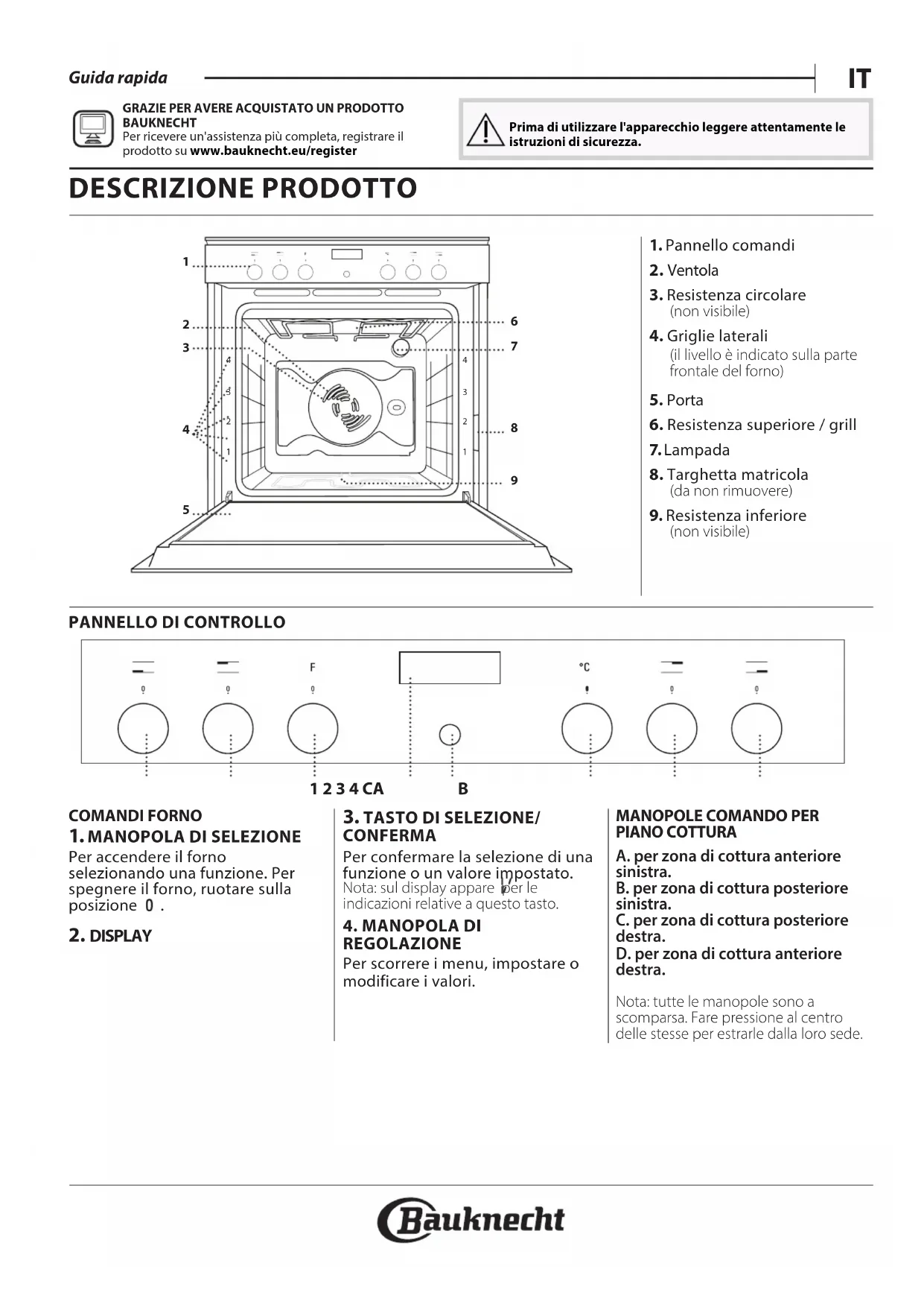 Guida rapida GRAZIE PER AVERE ACQUISTATO UN PRODOTTO BAUKNECHTPer ricevere un'assistenza più completa, registrare il prodotto su www . bauknecht . eu / registerPrima di utilizzare l'apparecchio leggere attentamente le istruzioni di sicurezza. DESCRIZIONE PRODOTTO
