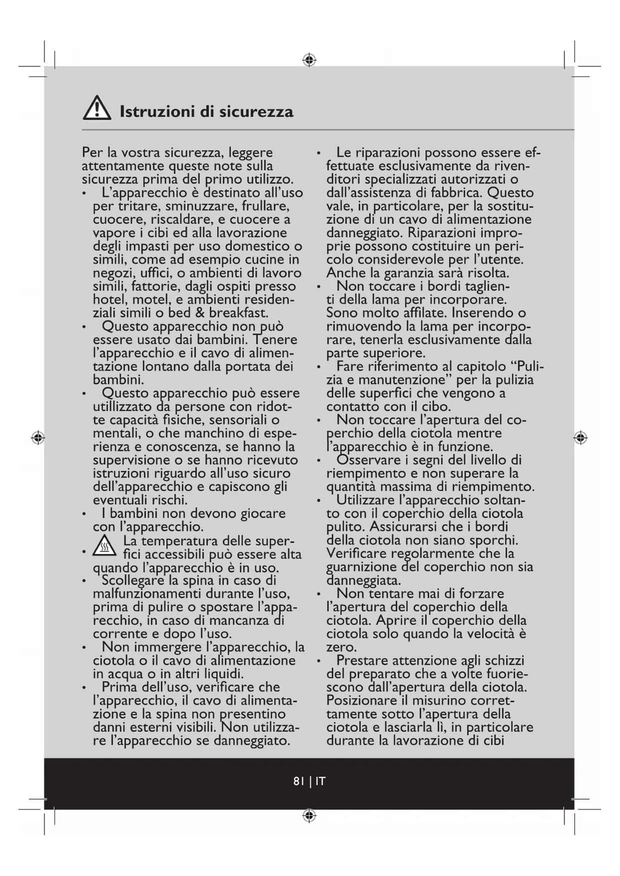 - Utilizzare esclusivamente il co- perchio fornito in dotazione per chiudere la ciotola.83 | IT Istruzioni di sicurezza