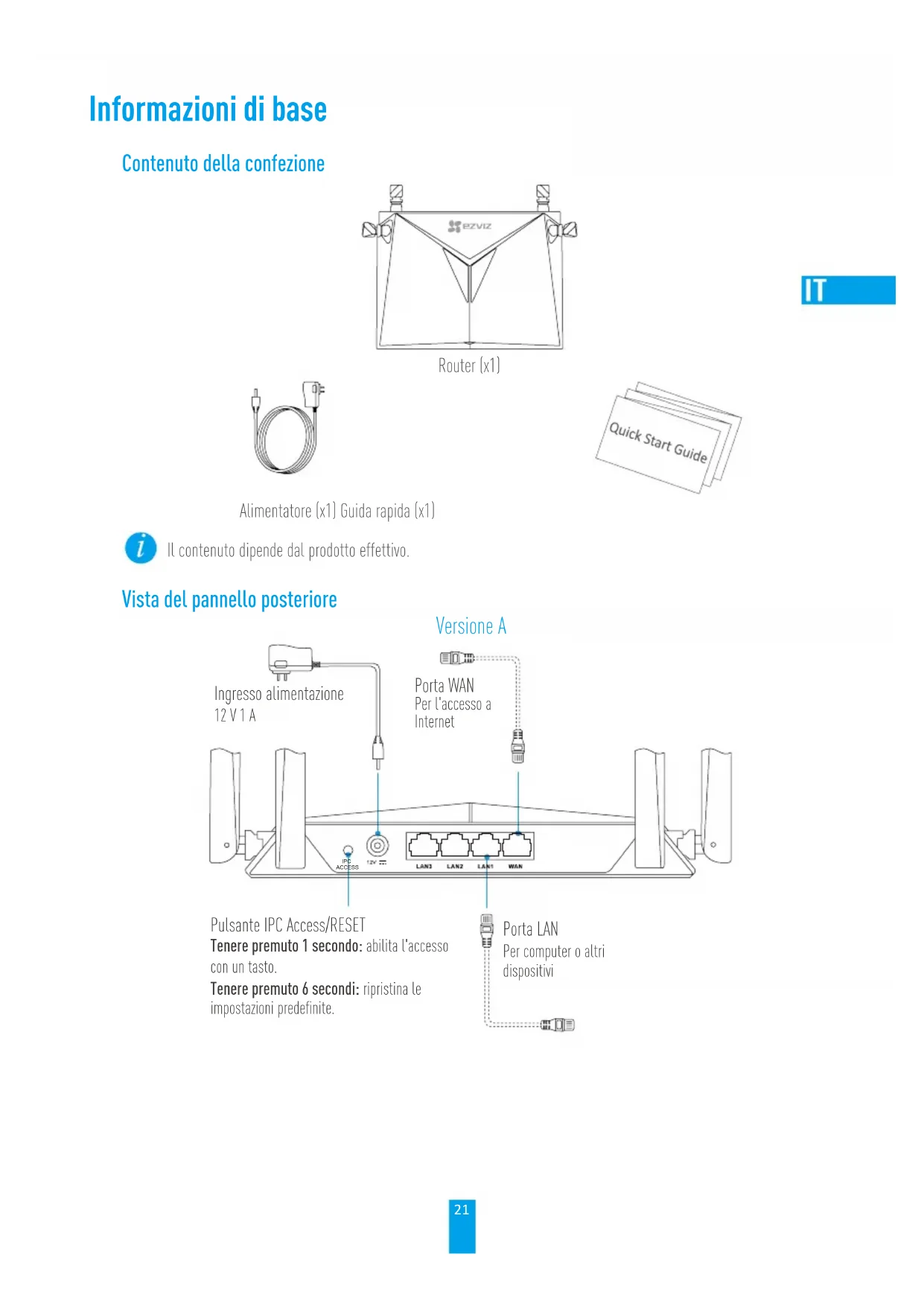 Wi-Fi.21 Informazioni di base Contenuto della confezione Router (x1) Alimentatore (x1) Guida rapida (x1) Il contenuto dipende dal prodotto effettivo. Vista del pannello posteriore Versione A IPC ACCESS Ingresso alimentazione 12 V 1 A Pulsante IPC Access/RESET Tenere premuto 1 secondo: abilita l'accesso con un tasto. Tenere premuto 6 secondi: ripristina le impostazioni predefinite. Porta WAN Per l'accesso a Internet Porta LAN Per computer o altri dispositivi22 Versione B Porta WAN Per l'accesso a Internet Ingresso alimentazione 12 V 1,5A Porta LAN Per computer o altri dispositivi Pulsante IPC Access/RESET Tenere premuto 1 secondo: abilita l'accesso con un tasto Tenere premuto 6 secondi: ripristina le impostazioni predefinite Accensione/Spegnimento *Porta USB Per disco USB o HDD portatile, ecc.