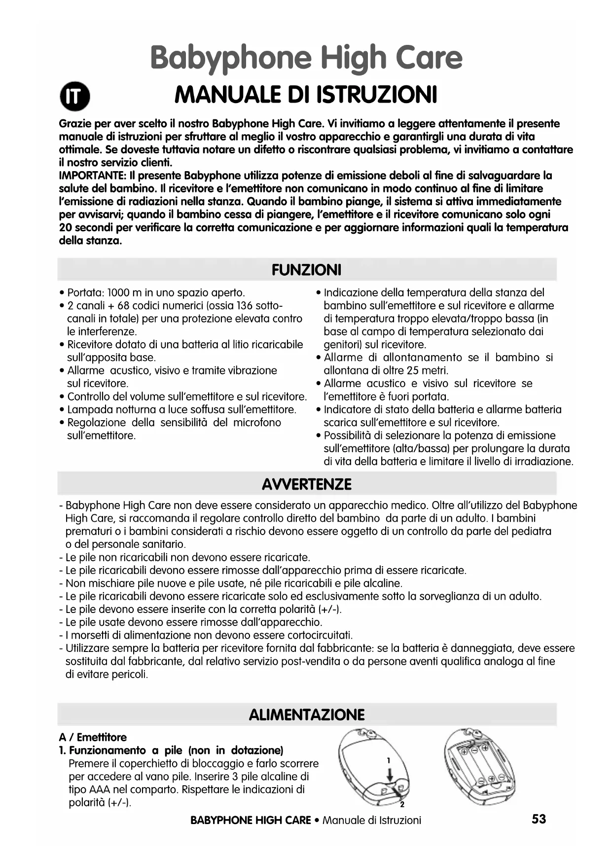 AVVERTENZE - Babyphone High Care non deve essere considerato un apparecchio medico. Oltre all’utilizzo del BabyphoneHigh Care, si raccomanda il regolare controllo diretto del bambino da parte di un adulto. I bambiniprematuri o i bambini considerati a rischio devono essere oggetto di un controllo da parte del pediatrao del personale sanitario.- Le pile non ricaricabili non devono essere ricaricate.- Le pile ricaricabili devono essere rimosse dall’apparecchio prima di essere ricaricate.- Non mischiare pile nuove e pile usate, né pile ricaricabili e pile alcaline.- Le pile ricaricabili devono essere ricaricate solo ed esclusivamente sotto la sorveglianza di un adulto.- Le pile devono essere inserite con la corretta polarità (+/-).- Le pile usate devono essere rimosse dall’apparecchio.- I morsetti di alimentazione non devono essere cortocircuitati.- Utilizzare sempre la batteria per ricevitore fornita dal fabbricante: se la batteria è danneggiata, deve esseresostituita dal fabbricante, dal relativo servizio post-vendita o da persone aventi qualifica analoga al finedi evitare pericoli. ALIMENTAZIONE A / Emettitore1. Funzionamento a pile (non in dotazione)Premere il coperchietto di bloccaggio e farlo scorrereper accedere al vano pile. Inserire 3 pile alcaline ditipo AAA nel comparto. Rispettare le indicazioni dipolarità (+/-). Babyphone High Care