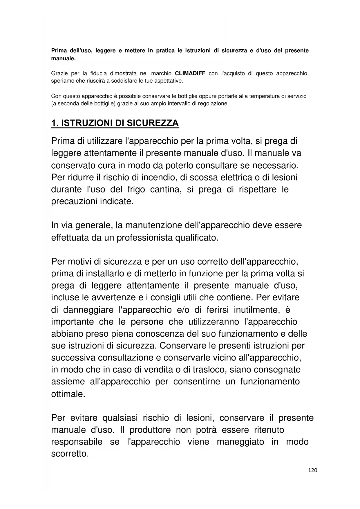 Prima di utilizzare l'apparecchio per la prima volta, si prega di leggere attentamente il presente manuale d'uso. Il manuale va conservato cura in modo da poterlo consultare se necessario. Per ridurre il rischio di incendio, di scossa elettrica o di lesioni durante l'uso del frigo cantina, si prega di rispettare le precauzioni indicate. In via generale, la manutenzione dell'apparecchio deve essere effettuata da un professionista qualificato. Per motivi di sicurezza e per un uso corretto dell'apparecchio, prima di installarlo e di metterlo in funzione per la prima volta si prega di leggere attentamente il presente manuale d'uso, incluse le avvertenze e i consigli utili che contiene. Per evitare di danneggiare l'apparecchio e/o di ferirsi inutilmente, è importante che le persone che utilizzeranno l'apparecchio abbiano preso piena conoscenza del suo funzionamento e delle sue istruzioni di sicurezza. Conservare le presenti istruzioni per successiva consultazione e conservarle vicino all'apparecchio, in modo che in caso di vendita o di trasloco, siano consegnate assieme all'apparecchio per consentirne un funzionamento ottimale. Per evitare qualsiasi rischio di lesioni, conservare il presente manuale d'uso. Il produttore non potrà essere ritenuto responsabile se l'apparecchio viene maneggiato in modo scorretto.121 Questo apparecchio è destinato esclusivamente ad uso domestico ed è previsto per la conservazione di bevande speciali ad una temperatura di conservazione più alta di quella di uno scomparto per prodotti freschi. In nessun caso questo apparecchio è destinato a conservare prodotti freschi. Verificare che la tensione dell'impianto elettrico della casa corrisponda a quella indicata sulla targa informativa: l'apparecchio deve essere collegato ad una presa di terra regolamentare. Riparazioni o collegamenti scorretti possono rappresentare un rischio per la sicurezza. Se si ha il minimo dubbio, far controllare il proprio impianto elettrico da un professionista. Per la tua protezione, questo apparecchio deve essere collegato correttamente ad una presa di terra. Non tagliare né togliere il filo di terra dal cavo di alimentazione fornito. Per motivi di sicurezza, non usare prolunghe. Se l'apparecchio si fosse rovinato (ad esempio per un forte urto) o danneggiato (sovratensione dovuta a fulmine, allagamento, incendio), può essere pericoloso utilizzarlo. Scollegare l'apparecchio dalla presa elettrica e farlo controllare da un riparatore professionista autorizzato. Per evitare pericoli, non sostituire da soli il cavo di alimentazione se rovinato. Contattare il proprio rivenditore, un centro assistenza autorizzato o un riparatore professionista. Questo apparecchio deve essere posizionato in modo che la presa a muro sia raggiungibile. Non spostare l'apparecchio una volta che è stato caricato con i vini perché la scocca potrebbe122 deformarsi, oltre a dover fare delle riparazioni. I componenti elettrici non devono essere a vista. Tenere i bambini lontano dall'apparecchio. Non usare l'apparecchio all'esterno. Se si fosse sparso accidentalmente del liquido (rottura di una bottiglia, ecc.) sui componenti elettrici (motore, ecc.), scollegare immediatamente l'apparecchio dalla presa elettrica. Per evitare il rischio di incendio, di scossa elettrica o di lesioni, non immergere il cavo di alimentazione, la spina o l'apparecchio stesso in acqua o in qualsiasi altro liquido. Non toccare l'apparecchio con le mani bagnate. Collocare l'apparecchio lontano da fonti di calore e non esporlo direttamente alla luce del sole. Non far pendere il cavo di alimentazione da un tavolo e non metterlo a contatto con angoli taglienti o superfici calde. Per scollegare l'apparecchio dalla corrente, non tirare il cavo di alimentazione ma afferrarlo dalla spina. Verificare che la zona dove verrà installato l'apparecchio sia in grado di sostenerne il peso una volta caricato (una bottiglia da 75 cl pesa circa 1,3 kg). Il frigo cantina deve essere collocato su una superficie piana. Se deve essere appoggiato su un tappeto o sulla moquette, infilare sotto un supporto. Per evitare di danneggiare la cerniera della porta, aprirla completamente quando si estraggono i ripiani.123 Sicurezza dei bambini e delle persone vulnerabili Questo apparecchio può essere utilizzato da bambini di età pari e superiore agli 8 anni e da persone con ridotte capacità fisiche, sensoriali o mentali o senza esperienza e conoscenza a patto che vengano sorvegliati o istruiti sull'utilizzo dell'apparecchio in sicurezza e che capiscano i pericoli connessi all'utilizzo dell'apparecchio. La pulizia e la manutenzione non devono essere eseguite da bambini, salvo se di età superiore agli 8 anni e sotto sorveglianza. Conservare il materiale d'imballaggio fuori dalla portata dei bambini. Pericolo di soffocamento. Il rischio che i bambini possano rimanere intrappolati all'interno dell'apparecchio e soffocare non deve essere sottovalutato. Gli apparecchi da gettare o abbandonati rappresentano comunque un pericolo anche se vengono "lasciati in garage solo per qualche giorno". Quando l'apparecchio deve essere gettato via, staccare la spina dalla presa di corrente, tagliare il cavo di alimentazione (il più vicino possibile all'apparecchio) e smontare la porta per evitare che i bambini giocando prendano la scossa o si chiudano dentro l'apparecchio. Se l'apparecchio, dotato di una guarnizione magnetica sulla porta, deve sostituire un altro apparecchio dotato di chiusura a molla sulla porta o sulla cerniera, accertarsi di rendere inutilizzabile la chiusura a molla prima di gettare il vecchio apparecchio. In questo modo si evita che i bambini giocando restino intrappolati dentro l'apparecchio. Tenere l'apparecchio e il suo cavo fuori della portata dei bambini con meno di 8 anni.124 Prima di gettare via il frigo cantina, ricordarsi di smontare la porta. Rimuovere anche i ripiani all'interno dell'apparecchio, in modo che i bambini non possano giocarci o salirci sopra.