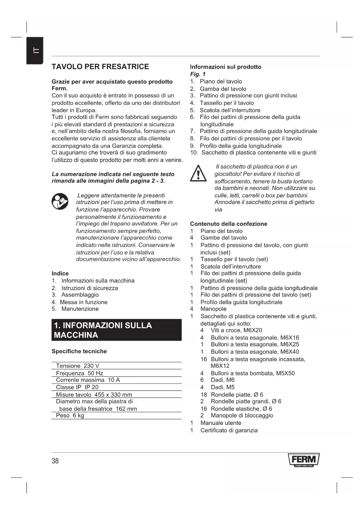 MACCHINA Specifiche tecniche Tensione 230 V Frequenza 50 Hz Corrente massima 10 A Classe IP IP 20 Misure tavolo 455 x 330 mm Diametro max della piastra di base della fresatrice 162 mm Peso 6 kg Informazioni sul prodotto Fig. 1