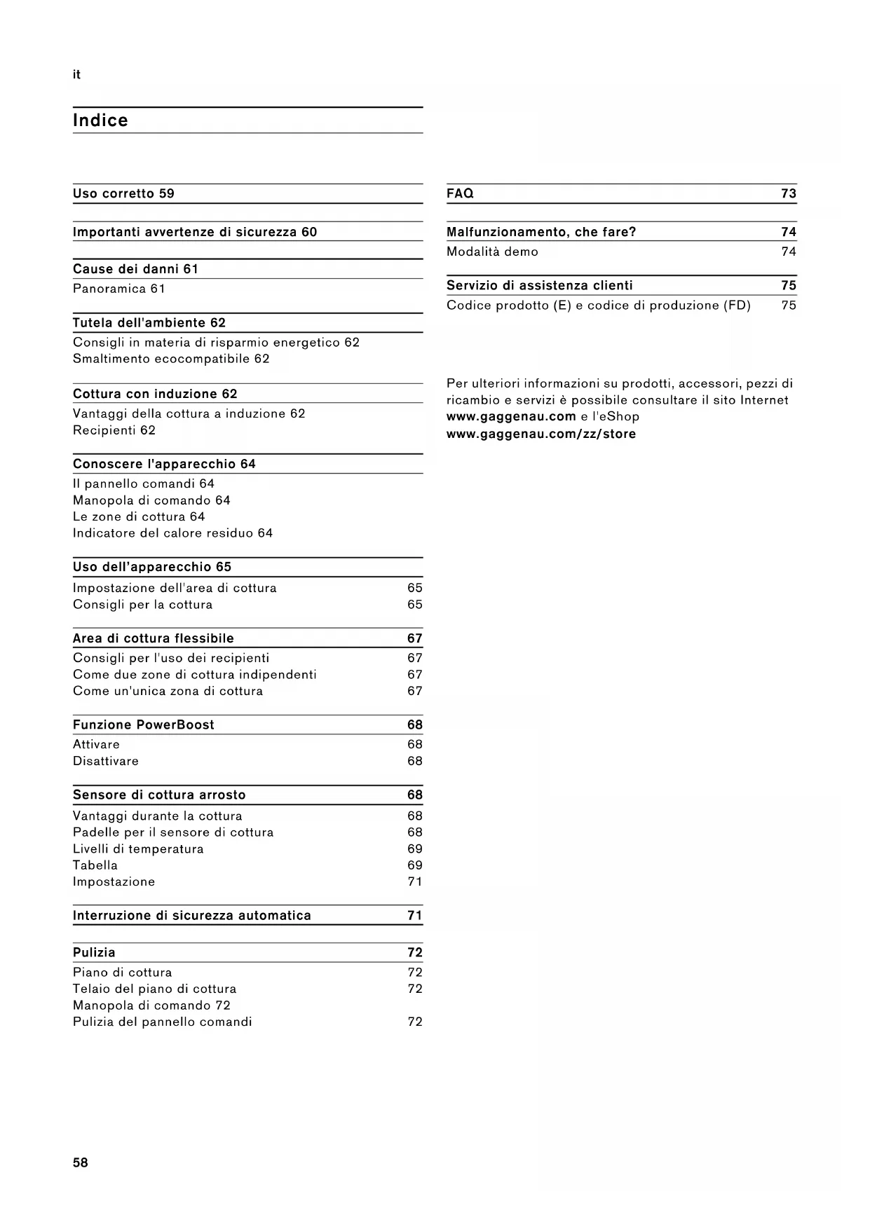 Indice Istruzioni per l’uso Uso corretto 59 Importanti avvertenze di sicurezza 60 Cause dei danni 61 Panoramica 61 Tutela dell'ambiente 62 Consigli in materia di risparmio energetico 62 Smaltimento ecocompatibile 62 Cottura con induzione 62 Vantaggi della cottura a induzione 62 Recipienti 62 Conoscere l'apparecchio 64 Il pannello comandi 64 Manopola di comando 64 Le zone di cottura 64 Indicatore del calore residuo 64 Uso dell’apparecchio 65 Impostazione dell'area di cottura 65 Consigli per la cottura 65 Area di cottura flessibile 67 Consigli per l'uso dei recipienti 67 Come due zone di cottura indipendenti 67 Come un'unica zona di cottura 67 Funzione PowerBoost 68 Attivare 68 Disattivare 68 Sensore di cottura arrosto 68 Vantaggi durante la cottura 68 Padelle per il sensore di cottura 68 Livelli di temperatura 69 Tabella 69 Impostazione 71 Interruzione di sicurezza automatica 71 Pulizia 72 Piano di cottura 72 Telaio del piano di cottura 72 Manopola di comando 72 Pulizia del pannello comandi 72 FAQ 73 Malfunzionamento, che fare? 74 Modalità demo 74 Servizio di assistenza clienti 75 Codice prodotto (E) e codice di produzione (FD) 75 Per ulteriori informazioni su prodotti, accessori, pezzi di ricambio e servizi è possibile consultare il sito Internet www.gaggenau.com e l'eShop www.gaggenau.com/zz/store59 Service après-vente