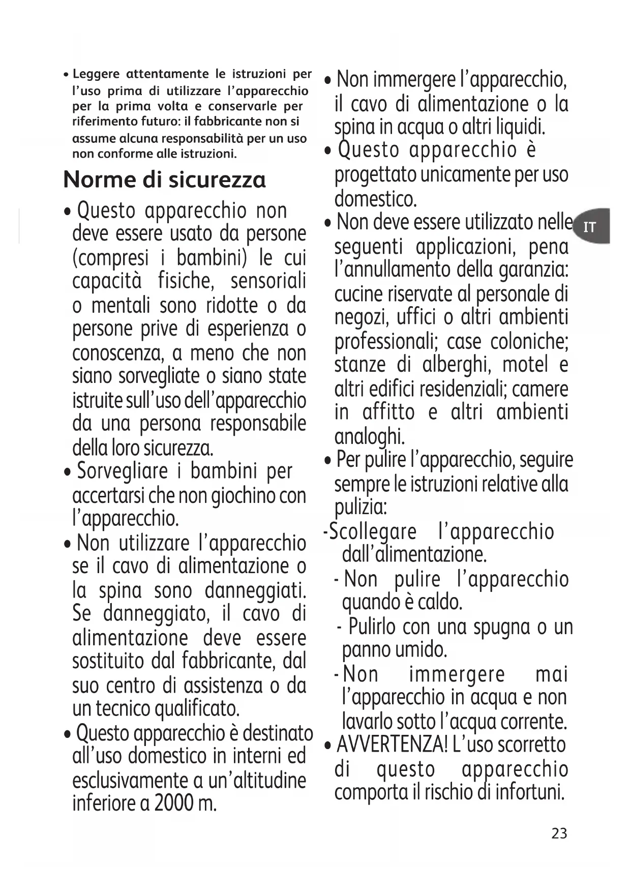 - Leggere attentamente le istruzioni per l’uso prima di utilizzare l’apparecchio per la prima volta e conservarle per riferimento futuro: il fabbricante non si assume alcuna responsabilità per un uso non conforme alle istruzioni. Norme di sicurezza