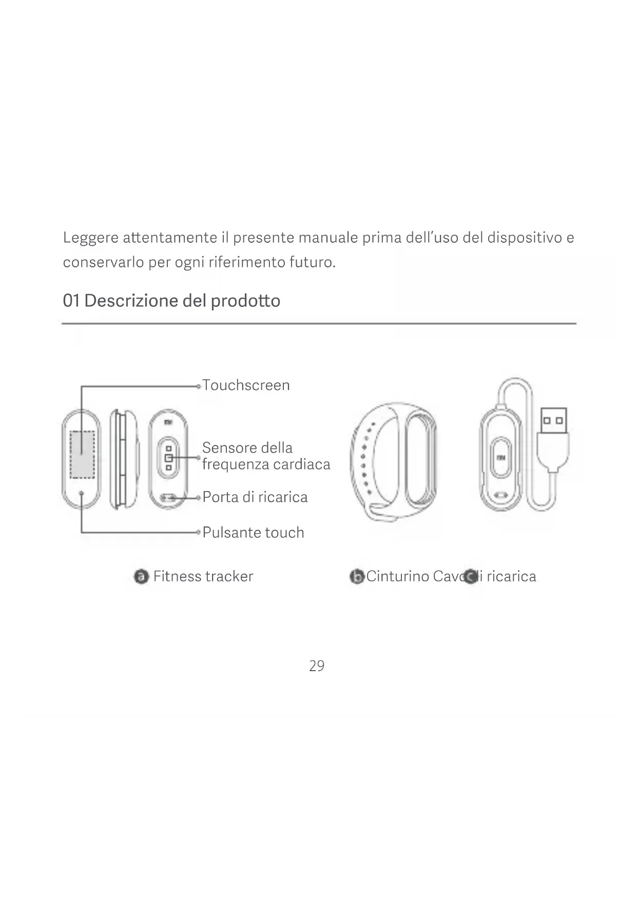 Cinturino Cavo di ricarica Fitness tracker Touchscreen Pulsante touch Sensore della frequenza cardiaca Porta di ricarica30 02 Installazione