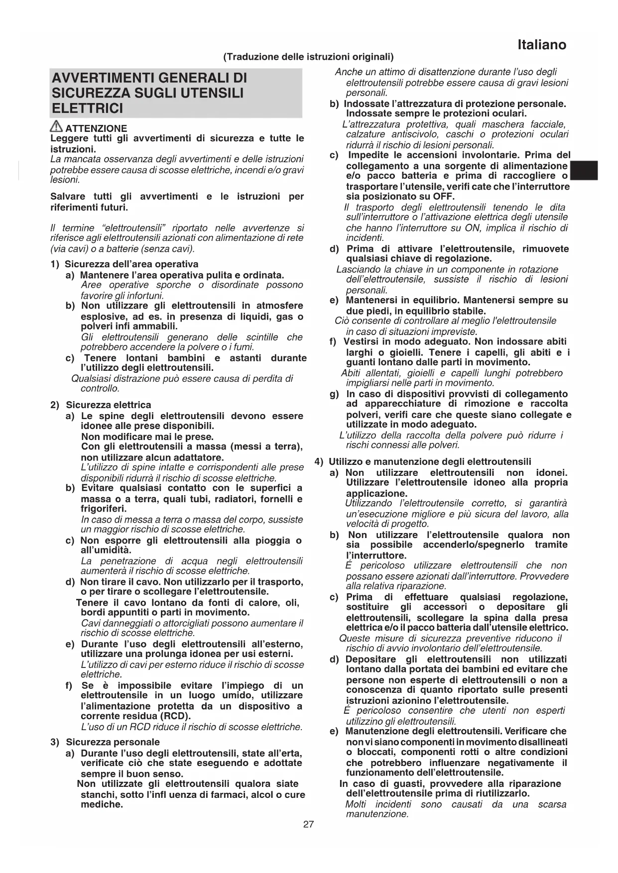 ELETTRICI ATTENZIONE Leggere tutti gli avvertimenti di sicurezza e tutte le istruzioni. La mancata osservanza degli avvertimenti e delle istruzioni potrebbe essere causa di scosse elettriche, incendi e/o gravi lesioni. Salvare tutti gli avvertimenti e le istruzioni per riferimenti futuri. Il termine “elettroutensili” riportato nelle avvertenze si riferisce agli elettroutensili azionati con alimentazione di rete (via cavi) o a batterie (senza cavi).