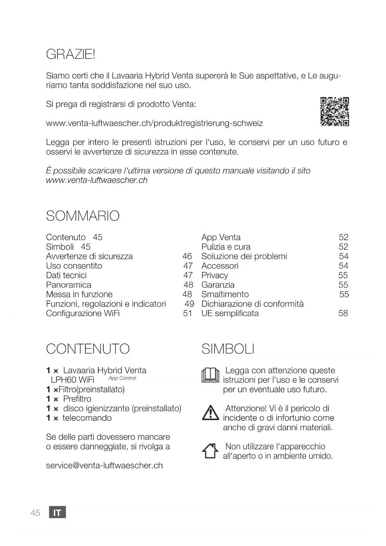 Reiniger Venta Reiniger 1 Toebehoren zijn verkrijgbaar op www.venta-airwasher.nl GARANTIE Op grond van de hoge kwaliteit garandeert Venta Benelux B.V. voor de duur van twee jaar na de aanschafdatum dat dit product bij correct gebruik geen gebreken vertoont. Wanneer er desondanks een materiaal- of fabricagefout bestaat, verzoe- ken wij u om contact op te nemen met het VENTA Serviceteam of uw verkoper. Daarnaast gelden de algemene garantievoorwaarden van Venta: www.venta-airwasher.nl/service/garantie/ AFVOEREN Het symbool van de “vuilcontainer met een kruis erdoor” eist een ge- scheiden afvoer van afgedankte elektrische en elektronische apparatuur (AEEA) en lege batterijen. Dergelijke apparaten kunnen gevaarlijke en milieu- vervuilende stoen bevatten. Deze producten moeten worden ingeleverd bij een erkend inzamelpunt voor de recycling van elektrische en elektronische appara- ten en mogen niet met ongesorteerd huishoudelijk afval worden afgevoerd. Lever deze a.u.b. bij het milieustraat of de winkel in. Daardoor draagt u bij aan de bescher- ming van hulpbronnen en het milieu. Voor meer informatie kunt u zich wenden tot de plaatselijke instanties. Kinderen mogen in geen geval met plastic zakken en verpakkingsmateriaal spelen, omdat er risico op verstikking en letsel bestaat. Berg dergelijk materiaal veilig op of voer het op milieuvriendelijke wijze af.45 DE45 IT SIMBOLI Legga con attenzione queste istruzioni per l‘uso e le conservi per un eventuale uso futuro. Attenzione! Vi è il pericolo di incidente o di infortunio come anche di gravi danni materiali. Non utilizzare l‘apparecchio all‘aperto o in ambiente umido. CONTENUTO 1 × Lavaaria Hybrid Venta LPH60 WiFi App Control 1 × Filtro (preinstallato) 1 × Preltro 1 × disco igienizzante (preinstallato) 1 × telecomando Se delle parti dovessero mancare o essere danneggiate, si rivolga a service@venta-luftwaescher.ch SOMMARIO Contenuto 45 Simboli 45 Avvertenze di sicurezza 46 Uso consentito 47 Dati tecnici 47 Panoramica 48 Messa in funzione 48 Funzioni, regolazioni e indicatori 49 Congurazione WiFi 51 App Venta 52 Pulizia e cura 52 Soluzione dei problemi 54 Accessori 54 Privacy 55 Garanzia 55 Smaltimento 55 Dichiarazione di conformità UE semplicata 58 GRAZIE! Siamo certi che il Lavaaria Hybrid Venta supererà le Sue aspettative, e Le augu- riamo tanta soddisfazione nel suo uso. Si prega di registrarsi di prodotto Venta: www.venta-luftwaescher.ch/produktregistrierung-schweiz Legga per intero le presenti istruzioni per l‘uso, le conservi per un uso futuro e osservi le avvertenze di sicurezza in esse contenute. È possibile scaricare l‘ultima versione di questo manuale visitando il sito www.venta-luftwaescher.ch46DEVenta LPH60 WiFi App Control 46IT ∙ Questo apparecchio è idoneo all’uso da parte di bambini con un’età minima di 8 anni e da parte di persone con capacità siche, sensoriali o mentali limitate oppu- re in possesso di poca esperienza e di conoscenze in materia ridotte, sempre che essi/esse vengano supervisionati o che siano stati istruiti in merito al suo uti- lizzo e che abbiano compreso i possibili pericoli. ∙ L’apparecchio non è un giocattolo per bambini. ∙ La pulizia e la cura da parte dell’utilizzato- re non deve essere eseguita da bambini di età inferiore agli 8 anni o senza super- visione. ∙ Tenere lontano l’apparecchio e il suo cavo di alimentazione dai bambini di età infe- riore agli 8 anni. ∙ Un uso improprio può danneggiare l’ap- parecchio e causare lesioni corporee. ∙ Leggere per intero le istruzioni per l’uso prima di mettere in funzione l’apparec- chio e conservarle in buone condizioni per una eventuale consultazione futura. ∙ Collegare l’apparecchio solamente a prese di corrente idonee – Fare attenzio- ne che la tensione di rete corrisponda a quella riportata sulla targhetta di omolo- gazione applicata all’apparecchio. ∙ Prima di ogni intervento di pulizia o di ma- nutenzione e per spostare o trasportare l’apparecchio, estrarre la spina elettrica dalla presa di corrente. ∙ Non mettere mai in funzione il Lavaaria Hybrid se il cavo di alimentazione è dan- neggiato. ∙ I cavi di alimentazione di ricambio devo- no essere conformi al tipo “Spina elettrica con connettore tripolare IEC 320 C5‘. ∙ Non mettere mai in funzione il Lavaaria Hybrid dopo che è caduto per terra o se è stato danneggiato in altra maniera. ∙ Le riparazioni di apparecchi elettrici devo- no essere eseguite solamente da persone qualicate. Delle riparazioni non eseguite a regola d’arte possono generare notevoli pericoli per l’utilizzatore. ∙ Non sedersi assolutamente sull’apparec- chio e non appoggiarvi sopra degli og- getti. ∙ Non inlare oggetti estranei nell’apparec- chio. ∙ Non immergere mai l’apparecchio in ac- qua o in altri liquidi. ∙ Non tirare mai la spina per il cavo o con mani bagnate dalla presa di corrente. ∙ Il Lavaaria Hybrid deve essere messo in funzione solamente se completamente montato. ∙ Appoggiare il Lavaaria Hybrid solo su di una supercie piana ed asciutta. ∙ Mantenere dagli oggetti e dalle pareti una distanza minima di almeno 20 cm e, in alto, di almeno 50 cm. ∙ Posizionare l’apparecchio in maniera tale che non possa essere ribaltato e che nes- suno possa inciampare nell’apparecchio o nel cavo. ∙ Se l’apparecchio non viene utilizzato, estrarre la spina dalla presa di corrente. ∙ Non coprire mai né bloccare le fessure di ventilazione, al ne di evitare un surriscal- damento/danneggiamento dell’apparec- chio. ∙ Non riempire mai troppo il Lavaaria Hy- brid. ∙ Non trasportare mai né ribaltare il Lavaa- ria Hybrid con il contenitore pieno. ∙ Non è ammesso aggiungere all’acqua oli profumati, in quanto essi possono com- promettere il funzionamento del disco igienizzante. ∙ Venta Luftwäscher GmbH non risponde per danni causati da additivi di altri pro- duttori.