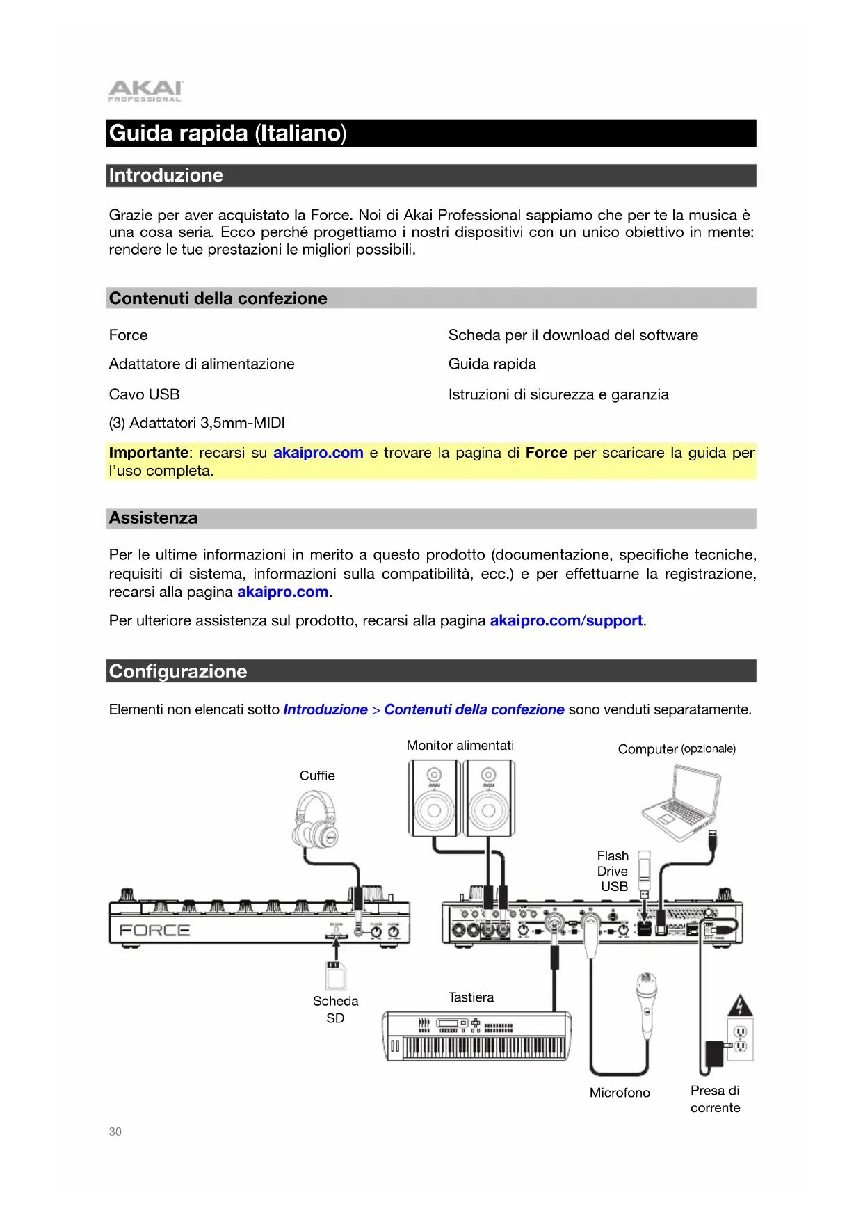 casque d’écoute. Master correspond au signal transmis par les sorties Master L/R. 3/4 correspond au signal transmis par les sorties 3/4.30 Guida rapida (Italiano) Introduzione Grazie per aver acquistato la Force. Noi di Akai Professional sappiamo che per te la musica è una cosa seria. Ecco perché progettiamo i nostri dispositivi con un unico obiettivo in mente: rendere le tue prestazioni le migliori possibili. Contenuti della confezione Force Adattatore di alimentazione Cavo USB (3) Adattatori 3,5mm-MIDI Scheda per il download del software Guida rapida Istruzioni di sicurezza e garanzia Importante: recarsi su akaipro.com e trovare la pagina di Force per scaricare la guida per l’uso completa. Assistenza Per le ultime informazioni in merito a questo prodotto (documentazione, specifiche tecniche, requisiti di sistema, informazioni sulla compatibilità, ecc.) e per effettuarne la registrazione, recarsi alla pagina akaipro.com. Per ulteriore assistenza sul prodotto, recarsi alla pagina akaipro.com/support. Configurazione Elementi non elencati sotto Introduzione > Contenuti della confezione sono venduti separatamente.
