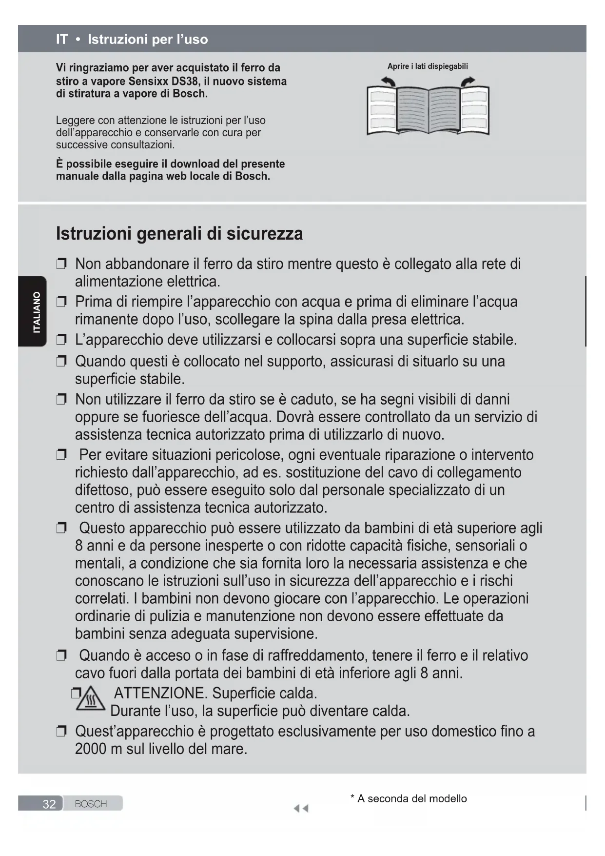 ATTENZIONE. Superficie calda. Durante l’uso, la superficie può diventare calda. ❐ Quest’apparecchio è progettato esclusivamente per uso domestico fino a 2000 m sul livello del mare. Vi ringraziamo per aver acquistato il ferro da stiro a vapore Sensixx DS38, il nuovo sistema di stiratura a vapore di Bosch. Leggere con attenzione le istruzioni per l’uso dell’apparecchio e conservarle con cura per successive consultazioni. È possibile eseguire il download del presente manuale dalla pagina web locale di Bosch. IT • Istruzioni per l’uso Aprire i lati dispiegabili33 B O S C H