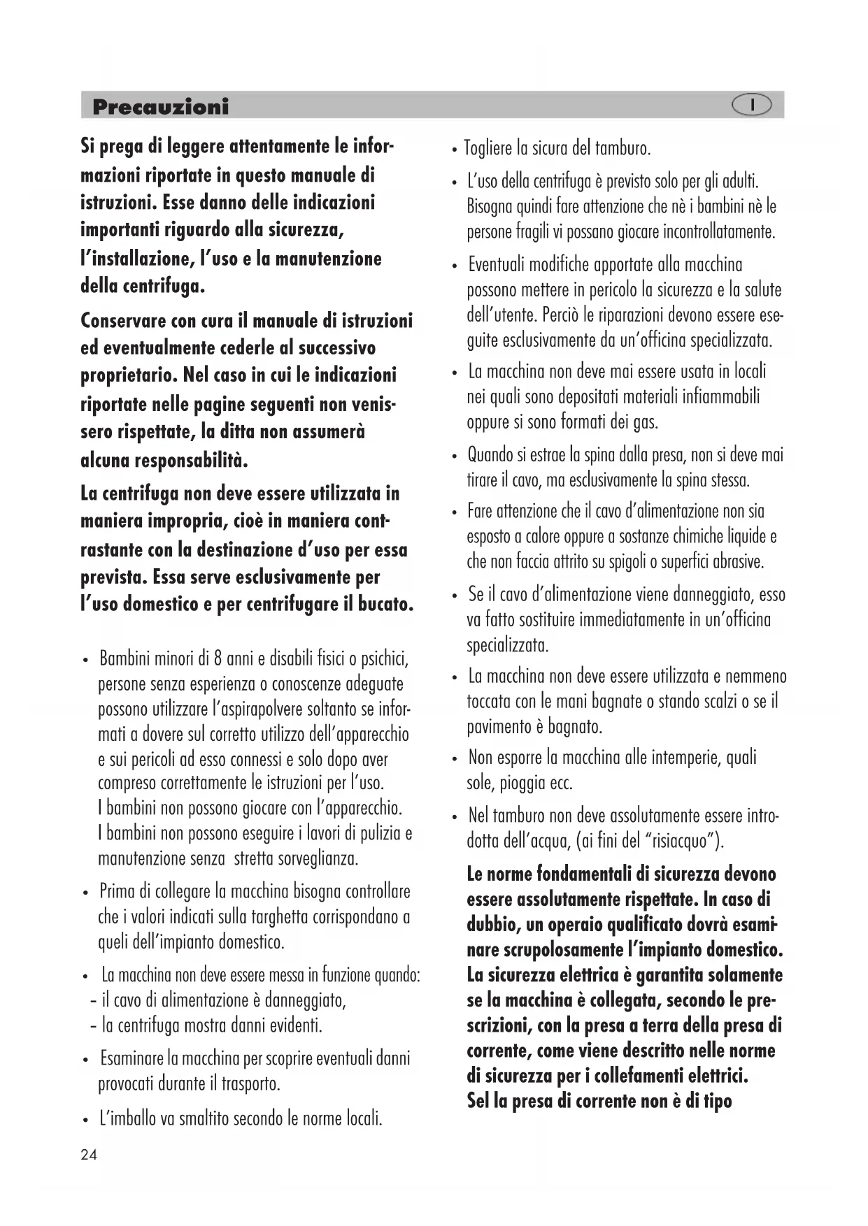 a las prescripciones dadas. Servicio postventa Pregunte a su distribuidor para averiguar la dirección o el teléfono del concesionario más cercano. Le rogamos que asimismo le comunique los datos indicados en la placa tipoló- gica que se encuentra en la parte posterior de su centrifu gadora CENTRI. Para mantener la seguridad de la máquina, encargue los trabajos de reparación, en especial aquellos que afectan a las partes eléctricas, a un electricista cualificado. En caso de avería, diríjase a su proveedor habitual o directamente al servicio postventa.24 Precauzioni Si prega di leggere attentamente le infor- mazioni riportate in questo manuale di istruzioni. Esse danno delle indicazioni importanti riguardo alla sicurezza, l’installazione, l’uso e la manutenzione della centrifuga. Conservare con cura il manuale di istruzioni ed eventualmente cederle al successivo proprietario. Nel caso in cui le indicazioni riportate nelle pagine seguenti non venis- sero rispettate, la ditta non assumerà alcuna responsabilità. La centrifuga non deve essere utilizzata in maniera impropria, cioè in maniera cont- rastante con la destinazione d’uso per essa prevista. Essa serve esclusivamente per l’uso domestico e per centrifugare il bucato.