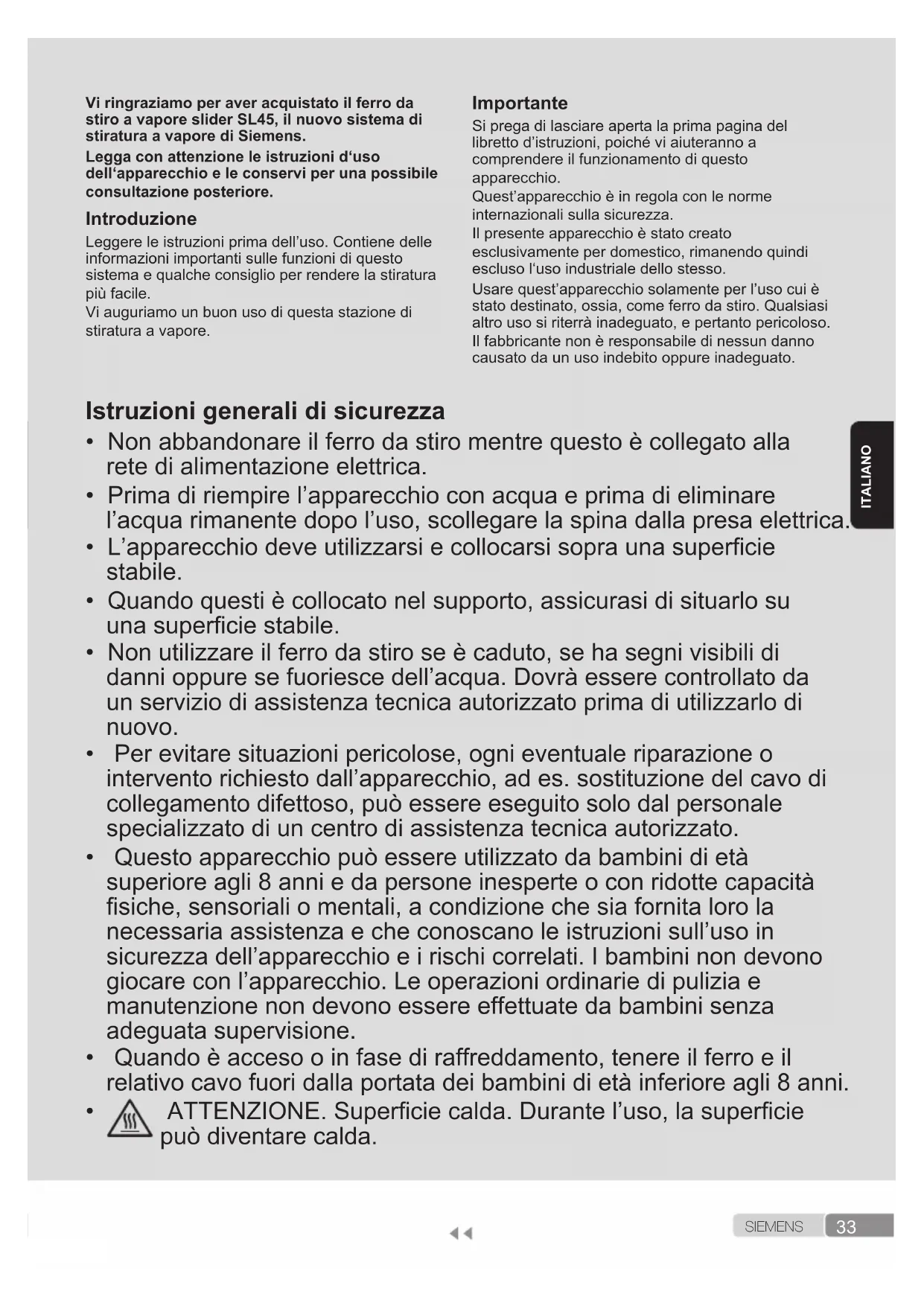 Quest’apparecchio raggiunge altissime temperature e produce vapore durante il suo uso, ciò potrebbe provocare scottature o bruciature in caso di utilizzo non corretto. Durante l’uso, il tubo del vapore, il corpo della caldaia, la piastra in metallo in fondo al poggia ferro rimovibile (2) e, in particolare, il ferro possono diventare caldi. Questo è normale. Non dirigere il vapore a persone o animali. Non permettere che il cavo entri in contatto con la piastra del ferro quando questi è caldo. È possibile che il sistema continui a emettere vapore per un breve periodo di tempo dopo il rilascio della le vetta: si tratta di una normale caratteristica del funzionamento.35 S I E M E N S