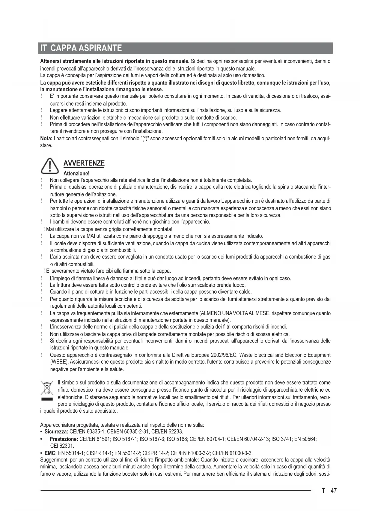 Attenersi strettamente alle istruzioni riportate in questo manuale. Si declina ogni responsabilità per eventuali inconvenienti, danni o incendi provocati all'apparecchio derivati dall'inosservanza delle istruzioni riportate in questo manuale. La cappa è concepita per l'aspirazione dei fumi e vapori della cottura ed è destinata al solo uso domestico. La cappa può avere estetiche differenti rispetto a quanto illustrato nei disegni di questo libretto, comunque le istruzioni per l'uso, la manutenzione e l'installazione rimangono le stesse. ! E' importante conservare questo manuale per poterlo consultare in ogni momento. In caso di vendita, di cessione o di trasloco, assi- curarsi che resti insieme al prodotto. ! Leggere attentamente le istruzioni: ci sono importanti informazioni sull'installazione, sull'uso e sulla sicurezza. ! Non effettuare variazioni elettriche o meccaniche sul prodotto o sulle condotte di scarico. ! Prima di procedere nell'installazione dell'apparecchio vericare che tutti i componenti non siano danneggiati. In caso contrario contat- tare il rivenditore e non proseguire con l'installazione. Nota: I particolari contrassegnati con il simbolo "(*)" sono accessori opzionali forniti solo in alcuni modelli o particolari non forniti, da acqui- stare. AVVERTENZE Attenzione! ! Non collegare l’apparecchio alla rete elettrica nche l’installazione non è totalmente completata. ! Prima di qualsiasi operazione di pulizia o manutenzione, disinserire la cappa dalla rete elettrica togliendo la spina o staccando l’inter- ruttore generale dell’abitazione. ! Per tutte le operazioni di installazione e manutenzione utilizzare guanti da lavoro L’apparecchio non è destinato all’utilizzo da parte di bambini o persone con ridotte capacità siche sensoriali o mentali e con mancata esperienza e conoscenza a meno che essi non siano sotto la supervisione o istruiti nell’uso dell’apparecchiatura da una persona responsabile per la loro sicurezza. ! I bambini devono essere controllati afnché non giochino con l’apparecchio. ! Mai utilizzare la cappa senza griglia correttamente montata! ! La cappa non va MAI utilizzata come piano di appoggio a meno che non sia espressamente indicato. ! Il locale deve disporre di sufciente ventilazione, quando la cappa da cucina viene utilizzata contemporaneamente ad altri apparecchi a combustione di gas o altri combustibili. ! L’aria aspirata non deve essere convogliata in un condotto usato per lo scarico dei fumi prodotti da apparecchi a combustione di gas o di altri combustibili. ! E’ severamente vietato fare cibi alla amma sotto la cappa. ! L’impiego di amma libera è dannoso ai ltri e può dar luogo ad incendi, pertanto deve essere evitato in ogni caso. ! La frittura deve essere fatta sotto controllo onde evitare che l’olio surriscaldato prenda fuoco. ! Quando il piano di cottura è in funzione le parti accessibili della cappa possono diventare calde. ! Per quanto riguarda le misure tecniche e di sicurezza da adottare per lo scarico dei fumi attenersi strettamente a quanto previsto dai regolamenti delle autorità locali competenti. ! La cappa va frequentemente pulita sia internamente che esternamente (ALMENO UNA VOLTA AL MESE, rispettare comunque quanto espressamente indicato nelle istruzioni di manutenzione riportate in questo manuale). ! L’inosservanza delle norme di pulizia della cappa e della sostituzione e pulizia dei ltri comporta rischi di incendi. ! Non utilizzare o lasciare la cappa priva di lampade correttamente montate per possibile rischio di scossa elettrica. ! Si declina ogni responsabilità per eventuali inconvenienti, danni o incendi provocati all’apparecchio derivati dall’inosservanza delle istruzioni riportate in questo manuale. ! Questo apparecchio è contrassegnato in conformità alla Direttiva Europea 2002/96/EC, Waste Electrical and Electronic Equipment (WEEE). Assicurandosi che questo prodotto sia smaltito in modo corretto, l'utente contribuisce a prevenire le potenziali conseguenze negative per l'ambiente e la salute. Il simbolo sul prodotto o sulla documentazione di accompagnamento indica che questo prodotto non deve essere trattato come riuto domestico ma deve essere consegnato presso l'idoneo punto di raccolta per il riciclaggio di apparecchiature elettriche ed elettroniche. Disfarsene seguendo le normative locali per lo smaltimento dei riuti. Per ulteriori informazioni sul trattamento, recu- pero e riciclaggio di questo prodotto, contattare l'idoneo ufcio locale, il servizio di raccolta dei riuti domestici o il negozio presso il quale il prodotto è stato acquistato. Apparecchiatura progettata, testata e realizzata nel rispetto delle norme sulla: