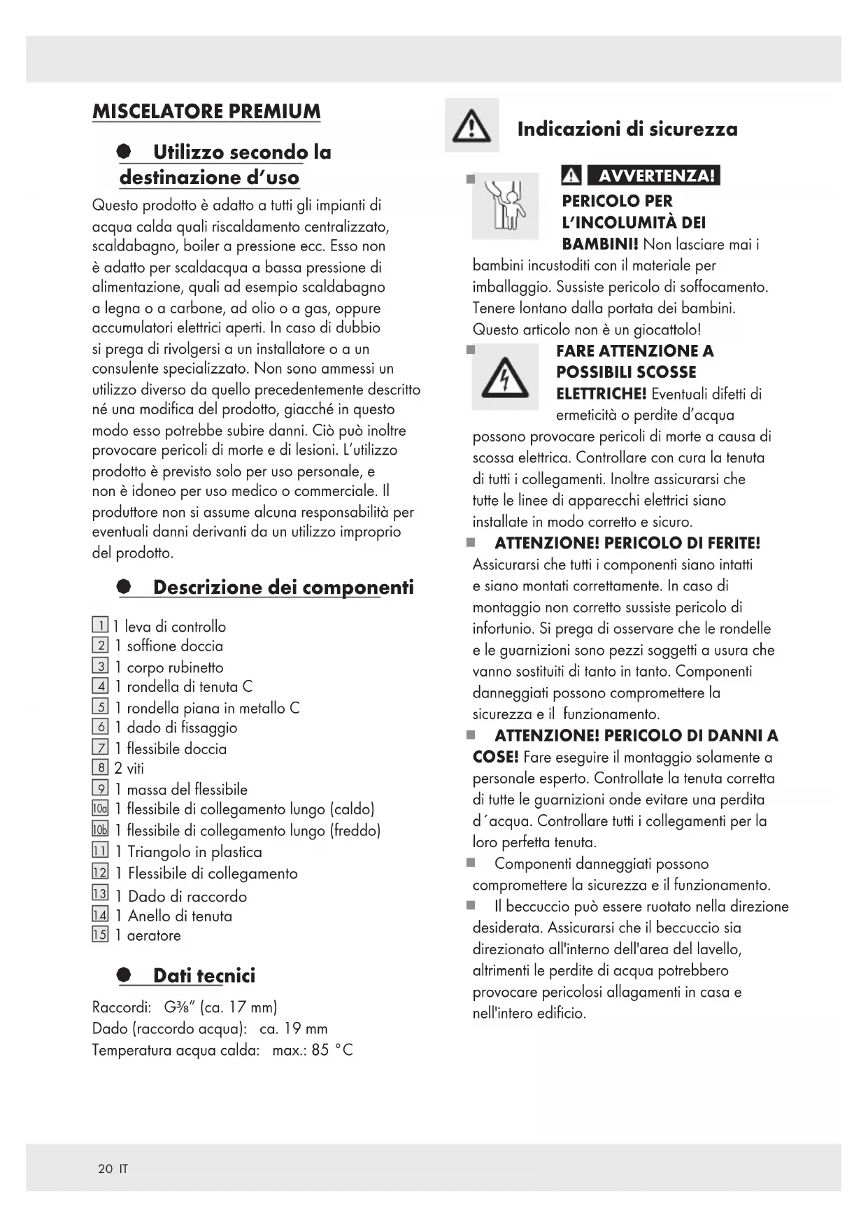 MISCELATORE PREMIUM § Utilizzo secondo la destinazione d’uso Questo prodotto è adatto a tutti gli impianti di acqua calda quali riscaldamento centralizzato, scaldabagno, boiler a pressione ecc. Esso non è adatto per scaldacqua a bassa pressione di alimentazione, quali ad esempio scaldabagno a legna o a carbone, ad olio o a gas, oppure accumulatori elettrici aperti. In caso di dubbio si prega di rivolgersi a un installatore o a un consulente specializzato. Non sono ammessi un utilizzo diverso da quello precedentemente descritto né una modifica del prodotto, giacché in questo modo esso potrebbe subire danni. Ciò può inoltre provocare pericoli di morte e di lesioni. L‘utilizzo prodotto è previsto solo per uso personale, e non è idoneo per uso medico o commerciale. Il produttore non si assume alcuna responsabilità per eventuali danni derivanti da un utilizzo improprio del prodotto. § Descrizione dei componenti