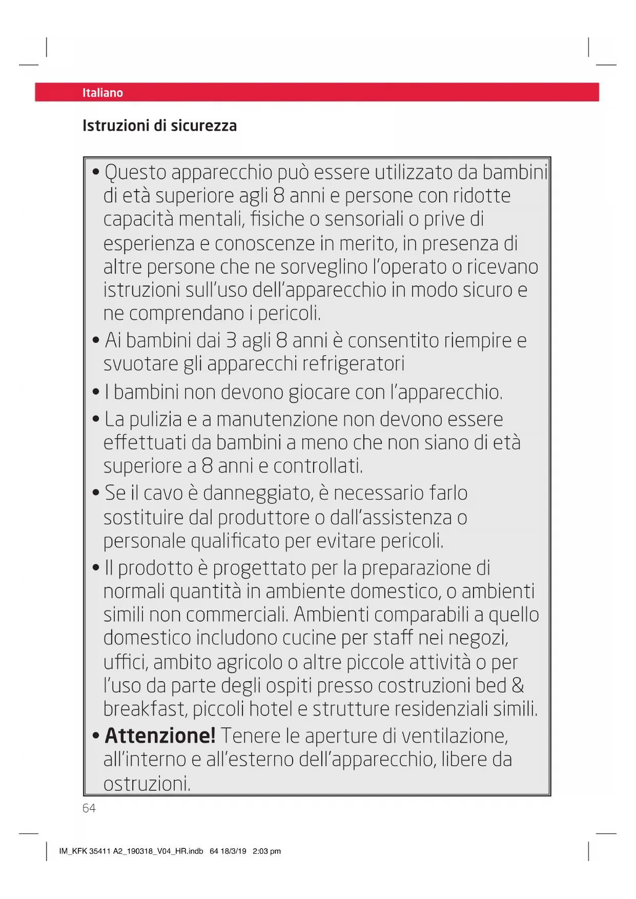 - Avvertenza: Il gas di rareddamento e di isolamento sono infiammabili. Quando si smaltisce il prodotto, farlo solo presso un centro di smaltimento autorizzato o contattare il responsabile dell’assistenza. IM_KFK 35411 A2_190318_V04_HR.indb 65 18/3/19 2:03 pmItaliano