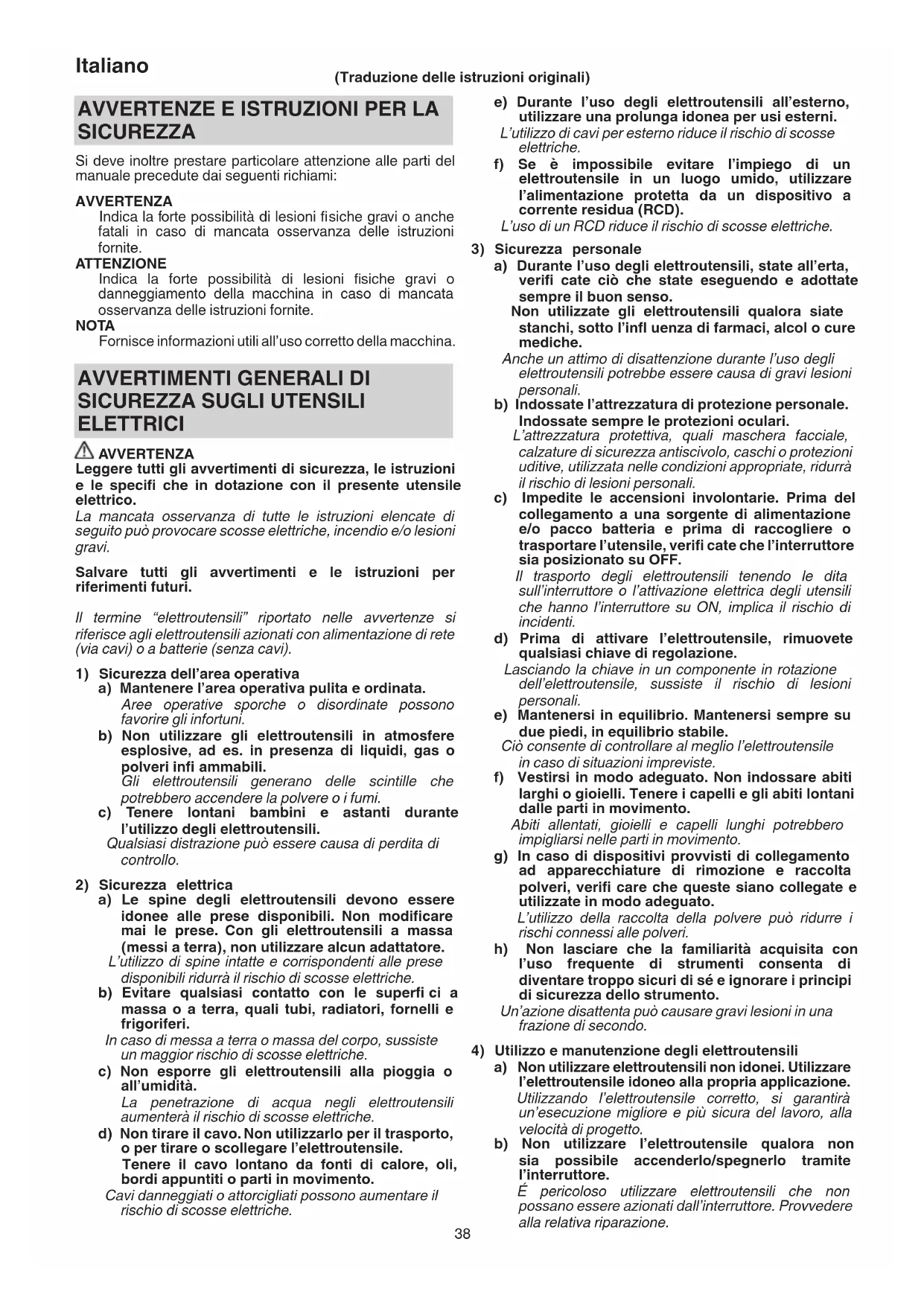 ELETTRICI AVVERTENZA Leggere tutti gli avvertimenti di sicurezza, le istruzioni e le specifi che in dotazione con il presente utensile elettrico. La mancata osservanza di tutte le istruzioni elencate di seguito può provocare scosse elettriche, incendio e/o lesioni gravi. Salvare tutti gli avvertimenti e le istruzioni per riferimenti futuri. Il termine “elettroutensili” riportato nelle avvertenze si riferisce agli elettroutensili azionati con alimentazione di rete (via cavi) o a batterie (senza cavi).