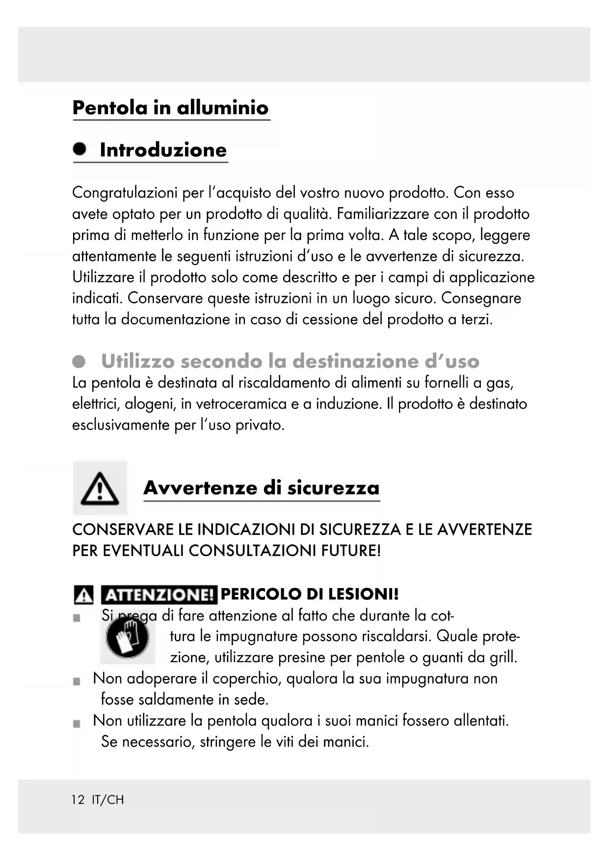 Utilizzo secondo la destinazione d’uso La pentola è destinata al riscaldamento di alimenti su fornelli a gas, elettrici, alogeni, in vetroceramica e a induzione. Il prodotto è destinato esclusivamente per l‘uso privato. Avvertenze di sicurezza CONSERVARE LE INDICAZIONI DI SICUREZZA E LE AVVERTENZE PER EVENTUALI CONSULTAZIONI FUTURE! PERICOLO DI LESIONI! Si prega di fare attenzione al fatto che durante la cot- tura le impugnature possono riscaldarsi. Quale prote- zione, utilizzare presine per pentole o guanti da grill. Non adoperare il coperchio, qualora la sua impugnatura non fosse saldamente in sede. Non utilizzare la pentola qualora i suoi manici fossero allentati. Se necessario, stringere le viti dei manici.13 IT/CH PERICOLO DI DANNI A COSE! Durante la cottura è molto importante sorvegliare costantemente pentole e tegami nelle quali viene scaldato del grasso. Il grasso tende a scaldarsi velocemente e a prendere fuoco. Qualora il grasso dovesse prendere fuoco, non estinguere l‘incendio con ac- qua! Soffocare le fiamme con il coperchio di una pentola o una spessa coperta di lana. Per non danneggiare il rivestimento antiaderenza, utilizzare sola- mente utensili da cucina in plastica o in legno resistenti al calore. Non tagliare il cibo direttamente nella pentola. Non porre carne bagnata nel grasso caldo. Il grasso che sprizza su una piastra da cucina incandescente può facilmente generare un incendio. Risparmiare energia! Scegliere la piastra di cottura in base al diametro del fondo della pentola, per evitare una dispersione di calore. 293043 (24 cm pentola in alluminio) diametro utile della base: ca. 18 cm 293046 (28 cm pentola in alluminio) diametro utile della base: ca. 22 cm. L’articolo è adatto (max. 160 °C per 1 ora) senza coperchio per mantenere caldo il cibo nel forno. Alte temperature possono provocare una mutazione del colore della parte esterna del prodotto. Questo effetto non è provocato da materiale difettoso e non influisce in nessun modo sulla qualità o la funzione del prodotto. Non collocare mai il prodotto sotto acqua corrente fredda qua- lora ancora caldo. La parte inferiore del prodotto potrebbe così danneggiarsi o distaccarsi. Questo prodotto si presta ad un lavaggio in lavastoviglie.14 IT/CH Una pulizia frequente con detergenti aggressivi può danneggiare la pentola e / o provocare una mutazione di colore della stessa. Il lavaggio in lavastoviglie può provocare una mutazione di colore delle parti in alluminio. ATTENZIONE! Il coperchio in vetro è fragile / non resistente agli urti! Per un lavaggio manuale della pentola utilizzare acqua calda con un comune detersivo. Evitare l’utilizzo di oggetti affilati e appuntiti per non danneggiare il materiale. Non tirare o spingere il prodotto su fornelli in vetroceramica o alogeni. L‘inosservanza del punto precedente può provocare danneggiamenti dovuti a sfregi. Si osservi che durante l‘utilizzo del prodotto, la chiara tonalità del colore del prodotto potrebbe subire una leggera mutazione. Que- ste mutazioni di colore sono solite quali conseguenza all‘utilizzo e non indicano alcun danneggiamento in termini di qualità e idoenità all‘uso.