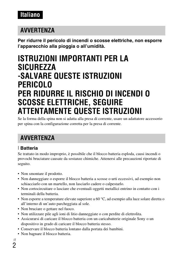 Avvertimento sui diritti d’autore I programmi televisivi, i film, le videocassette ed altri materiali possono essere protetti dai diritti d’autore. La registrazione non autorizzata di tali materiali può essere contraria ai provvedimenti di legge sui diritti d’autore. Nessuna compensazione per il contenuto danneggiato o la mancata registrazione Sony non può compensare per la mancata registrazione, la perdita o i danni al contenuto registrato a causa di un malfunzionamento della fotocamera o del supporto di registrazione, ecc. Pulizia della superficie della fotocamera Pulire la superficie della fotocamera con un panno morbido leggermente inumidito con l’acqua, quindi asciugare la superficie con un panno asciutto. Per evitare danni alla finitura o al rivestimento: – Non esporre la fotocamera a prodotti chimici quali solvente, benzina, alcol, panni monouso, insettifugo, crema solare o insetticida.