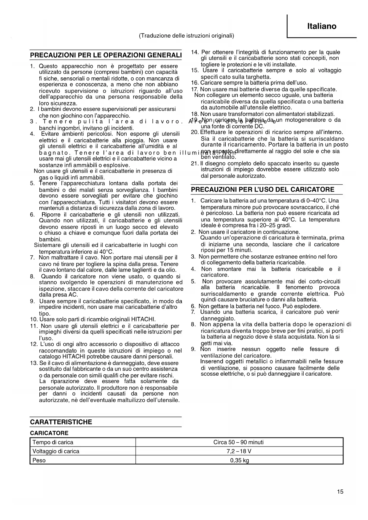 ventilazione del caricatore. Inserend oggetti metallici o infi ammabili nelle fessure di ventilazione, si possono causare facilmente delle scosse elettriche, o si può danneggiare il caricatore. (Traduzione delle istruzioni originali) CARATTERISTICHE CARICATORE Tempo di carica Circa 50 – 90 minuti Voltaggio di carica 7,2 – 18 V Peso 0,35 kg Italiano