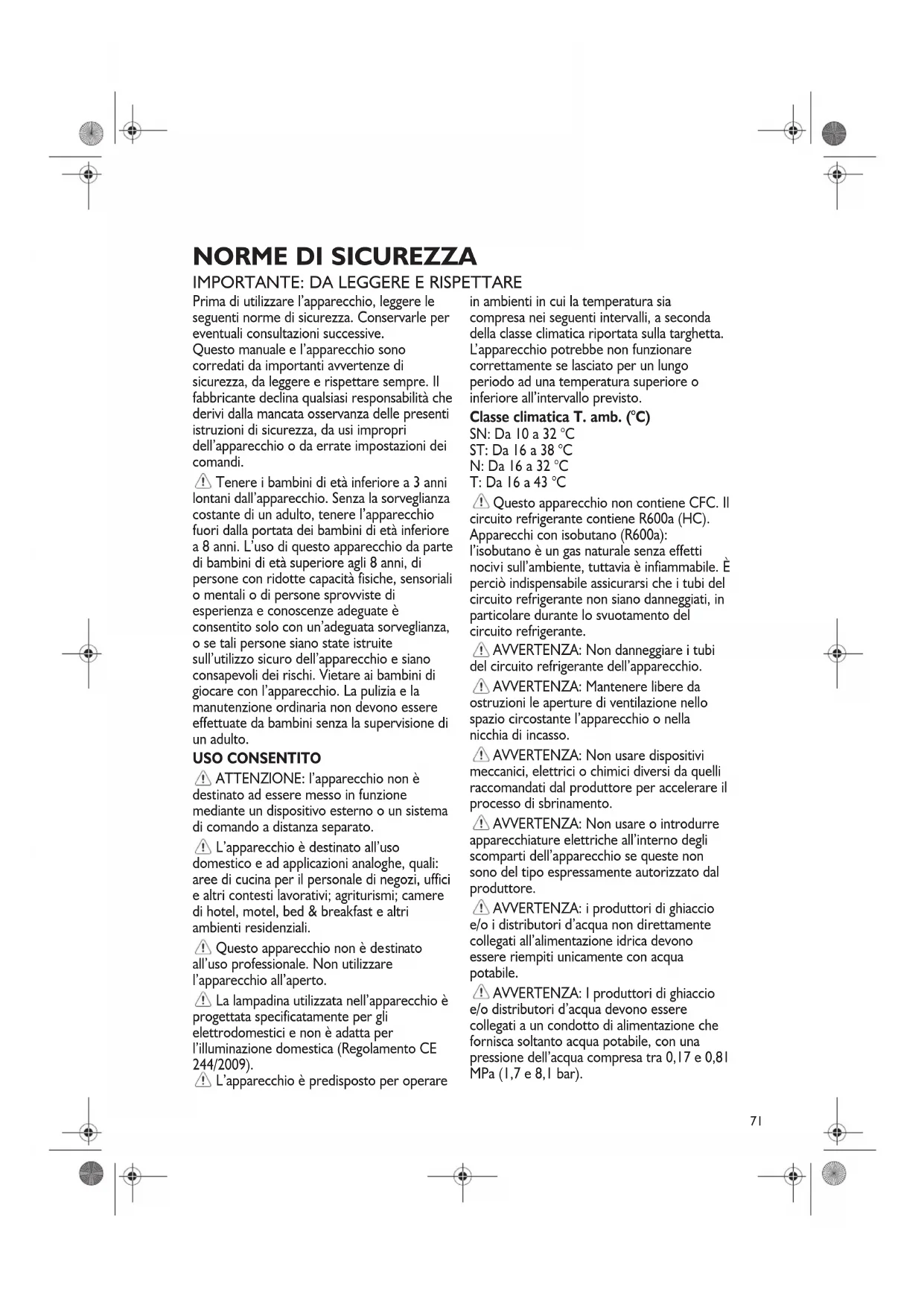 apparecchio potrebbe non funzionare correttamente se lasciato per un lungo periodo ad una temperatura superiore o inferiore all’intervallo previsto. Classe climatica T. amb. (°C) SN: Da 10 a 32 °C ST: Da 16 a 38 °C N: Da 16 a 32 °C T: Da 16 a 43 °C Questo apparecchio non contiene CFC. Il circuito refrigerante contiene R600a (HC). Apparecchi con isobutano (R600a): l’isobutano è un gas naturale senza effetti nociv i sull’ambiente, tuttavia è infiammabile. È perciò indispensabile assicurarsi che i tubi del circuito refrigerante non siano danneggiati, in particolare durante lo svuotamento del circuito refrigerante. AVVERTENZA: Non danneggiare i tubi del circuito refrigerante dell’apparecchio. AVVERTENZA: Mantenere libere da ostruzioni le aperture di ventilazione nello spazio circostante l’apparecchio o nella nicchia di incasso. AVVERTENZA: Non usare dispositivi meccanici, elettrici o chimici diversi da quelli raccomandati dal produttore per accelerare il processo di sbrinamento. AVVERTENZA: Non usare o introdurre apparecchiature elettriche all’interno degli scomparti dell’apparecchio se queste non sono del tipo espressamente autorizzato dal produttore. AVVERTENZA: i produttori di ghiaccio e/o i distributori d’acqua non di rettamente collegati all’alimentazione idrica devono essere riempiti unicamente con acqua potabile. AVVERTENZA: I produttori di ghiaccio e/o distributori d’acqua devono essere collegati a un condotto di alimentazione che fornisca soltanto acqua potabile, con una pressione dell’acqua compresa tra 0,17 e 0,81 MPa (1,7 e 8,1 bar).72