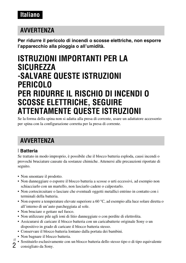 Sostiturlo esclusivamente con un blocco batteria dello tipo o di tipo equivalente consigliato da Sony.