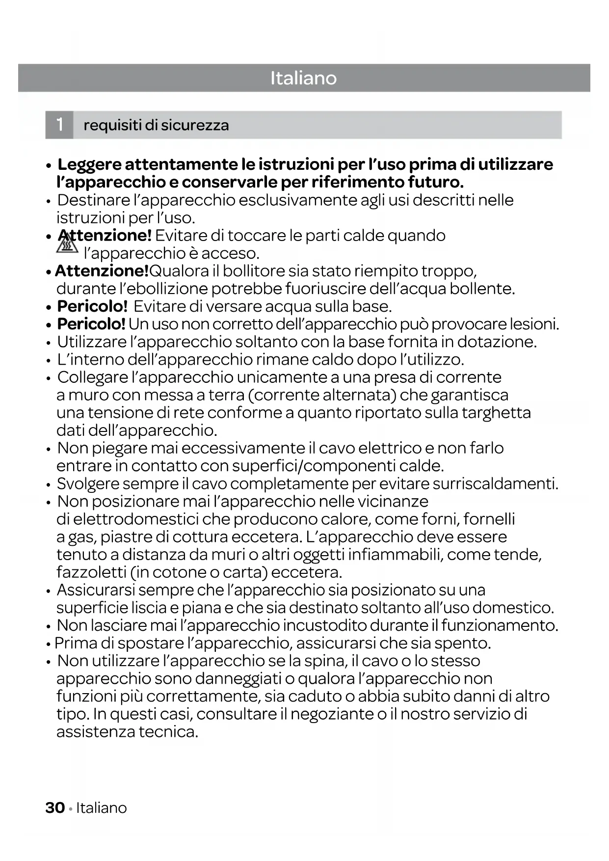 Il bollitore si spegne automaticamente a ebollizione raggiunta,analogamente alla spia luminosa. Qualora si desideri portare aebollizione un nuovo quantitativo di acqua, sarà necessario attendere ± 30 secondi perché l’apparecchio si raffreddi, prima di poterlo utilizzare nuovamente. È possibile spegnere il bollitore in qualsiasi momento riportando manualmente l’interruttore di accensione/spegnimento nella posizione iniziale. Il bollitore si spegnerà anche in caso venga rimosso dalla base durante il funzionamento: qualora lo si desideri riposizionare sulla base per continuare la bollitura, sarà necessario attendere ± 30 secondi perché si raffreddi, prima di poterlo utilizzare nuovamente. Attenzione! È possibile che si formi della condensa sul bordo della base. Si tratta di una situazione normale, che non haalcuna conseguenza sul funzionamento del bollitore. Attenzione: non accendere mai il bollitore vuoto. Qualora il bollitore venga acceso inavvertitamente in assenza diacqua al suo interno, entrerà in funzione la protezione contro il funzionamento a vuoto, che provvederà a spegnerlo automaticamente. In questo caso, rimuovere il bollitore dalla base e lasciarlo raffreddare per alcuni minuti, dopo di che sarà nuovamente possibile riempirlo di acqua e accenderlo. Assicurarsi che il coperchio sia sempre ben chiuso: in caso contrario, il bollitore non si spegnerà automaticamente al raggiungimento dell’ebollizione e continuerà a riscaldare l’acqua.• Przed użyciem urządzenia należy najpierw uważnie przeczytać całą instrukcję obsługi i zachować ją na potrzeby późniejszego wykorzystania.