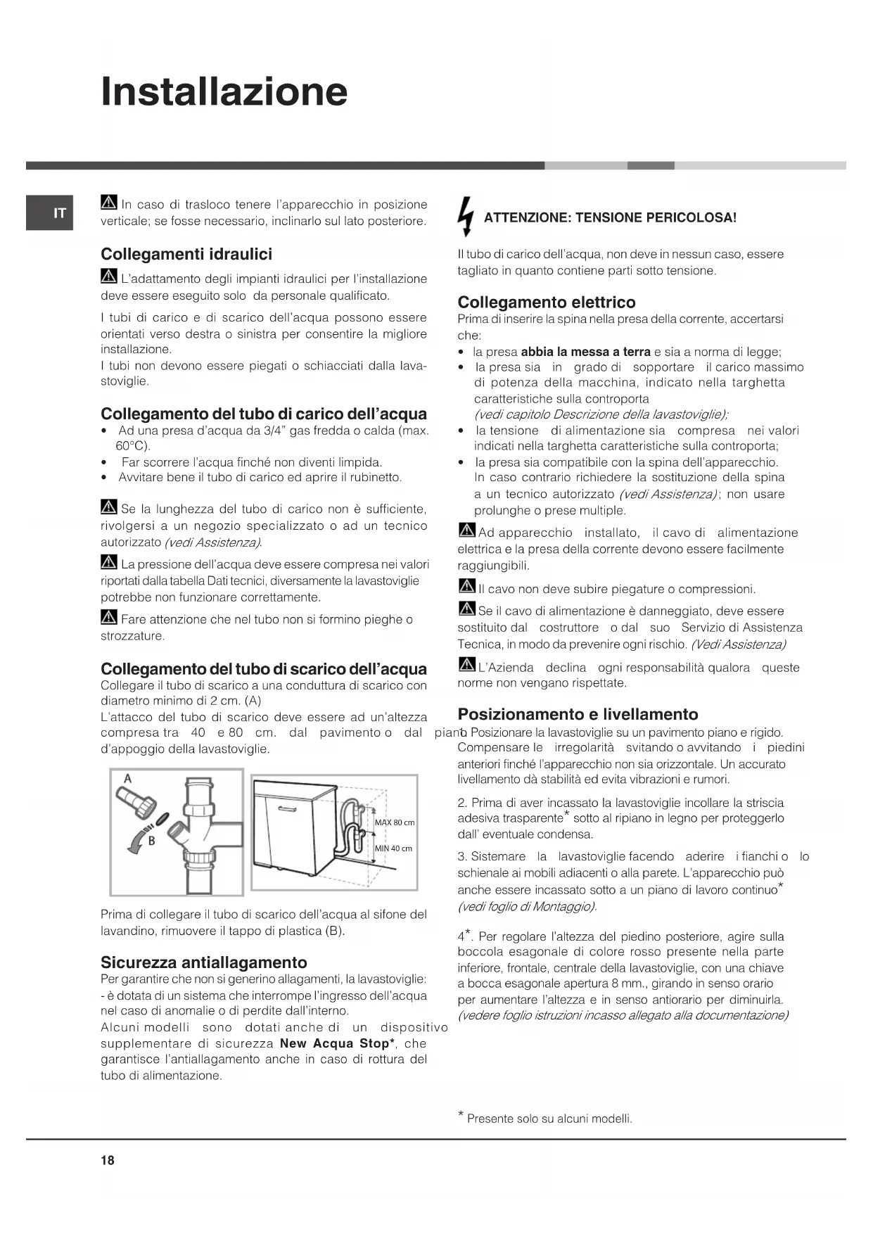 La pressione dell’acqua deve essere compresa nei valori riportati dalla tabella Dati tecnici, diversamente la lavastoviglie potrebbe non funzionare correttamente.Fareattenzionecheneltubononsiforminopiegheostrozzature. Collegamento del tubo di scarico dell’acqua Collegare il tubo di scarico a una conduttura di scarico con diametrominimodi2cm.(A)L’attacco del tubo di scarico deve essere ad un’altezza compresatra 40 e80 cm. dal pavimentoo dal pianod’appoggio della lavastoviglie.Prima di collegare il tubo di scarico dell’acqua al sifone del lavandino,rimuovereiltappodiplastica(B). Sicurezza antiallagamento Per garantire che non si generino allagamenti, la lavastoviglie:- è dotata di un sistema che interrompe l’ingresso dell’acqua nel caso di anomalie o di perdite dall’interno.Alcunimodelli sono dotatianchedi un dispositivosupplementare di sicurezza New Acqua Stop*, che garantisce l’antiallagamento anche in caso di rottura del tubo di alimentazione. ATTENZIONE: TENSIONE PERICOLOSA! Il tubo di carico dell’acqua, non deve in nessun caso, essere tagliato in quanto contiene parti sotto tensione. Collegamento elettrico Prima di inserire la spina nella presa della corrente, accertarsi che: