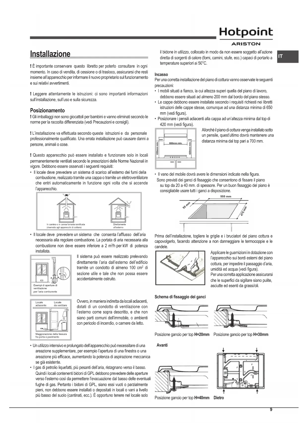 Installazione ! È importante conservare questo libretto per poterlo consultare in ogni momento. In caso di vendita, di cessione o di trasloco, assicurarsi che resti insieme all’apparecchio per informare il nuovo proprietario sul funzionamento e sui relativi avvertimenti. ! Leggere attentamente le istruzioni: ci sono importanti informazioni sull’installazione, sull’uso e sulla sicurezza. Posizionamento ! Gli imballaggi non sono giocattoli per bambini e vanno eliminati secondo le norme per la raccolta differenziata (vedi Precauzioni e consigli). ! L’installazione va effettuata secondo queste istruzioni e da personale professionalmente qualicato. Una errata installazione può causare danni a persone, animali o cose. ! Questo apparecchio può essere installato e funzionare solo in locali permanentemente ventilati secondo le prescrizioni delle Norme Nazionali in vigore. Debbono essere osservati i seguenti requisiti: