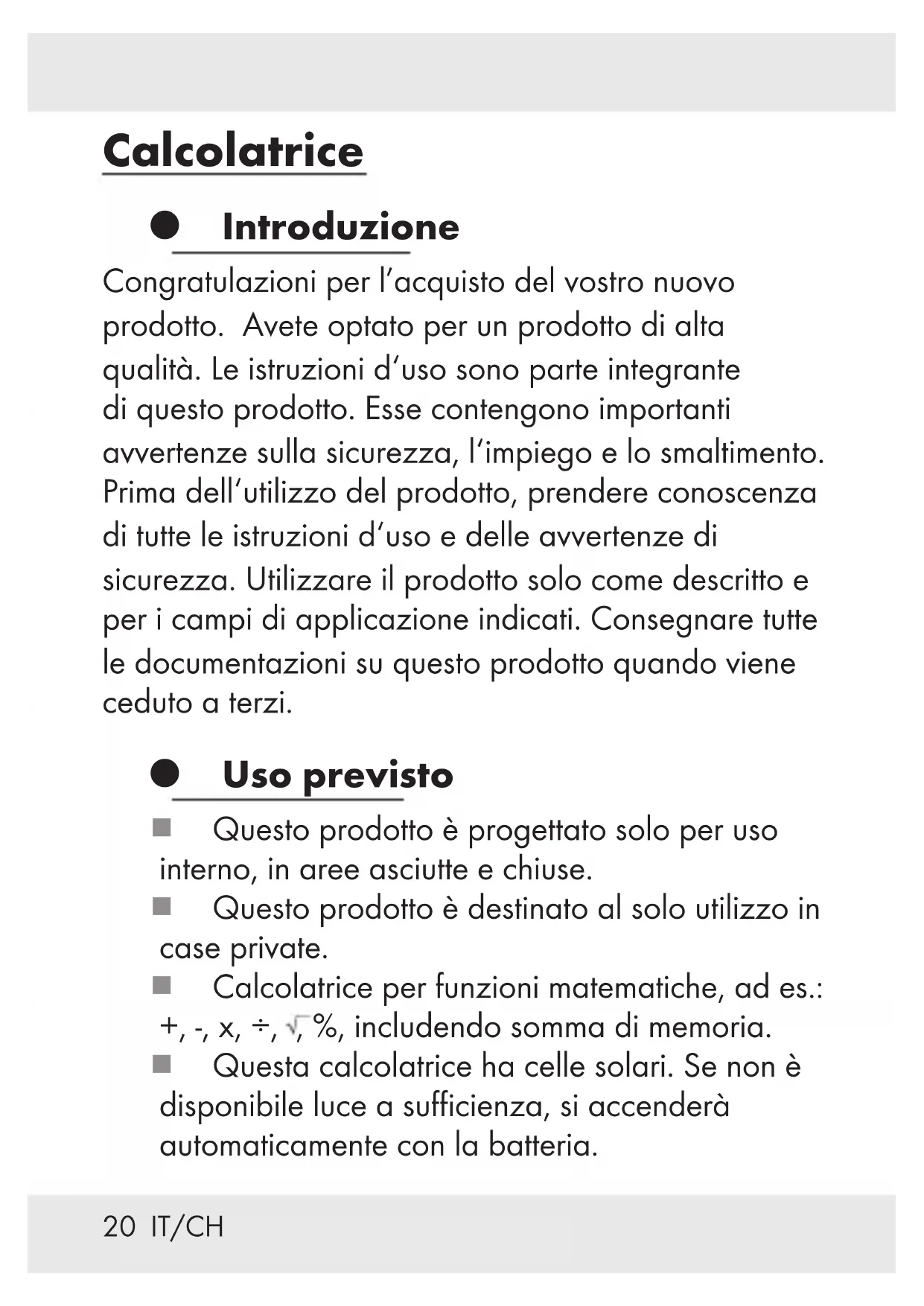 ¾ Ingerire le batterie potrebbe essere fatale. Le batterie devono essere conservate fuori dalla portata dei bambini piccoli. ¾ Ingerire una batteria a moneta può portare a soffocamento. Consultare immediatamente un medico. Istruzioni di sicurezza per la batteria ¾ ATTENZIONE! PERICOLO DI VITA! Conservare le batterie fuori dalla portata dei bambini. Non lasciare le batterie in giro. C‘è il rischio che i bambini o gli animali le ingeriscano. Consultare immediatamente un medico se una batteria è ingerita.22 IT/CH ¾ PERICOLO DI ESPLOSIONE! Non ricaricare mai batterie non ricaricabili, né cortocircuitare e / o aprire le batterie. Ciò può portarle a surriscaldarsi, bruciare o scoppiare. Non gettare mai le batterie nel fuoco o nell‘acqua. Le batterie potrebbero esplodere. ¾ Rimuovere immediatamente le batterie scariche dal prodotto. Altrimenti aumento il rischio di perdita di liquidi. ¾ Controllare regolarmente che le batterie non abbiano fuoriuscite. ¾ Le batterie che perdono o che sono danneggiate potrebbero provocare ustioni chimiche se entrano in contatto con la pelle; in tali casi si deve indossare dei guanti protettivi adeguati. ¾ Togliere le batterie dal prodotto se questo non è utilizzato per un lungo periodo. ¾ Assicurarsi che la polarità sia corretta quando si inseriscono le batterie. ¾ Togliere le batterie usate dal dispositivo. Batterie usate o molto vecchie potrebbero perdere liquidi. Il fluido chimico può danneggiare il prodotto. ¾ Nota: Il dispositivo si spegne automaticamente se non è adoperato per circa 11 minuti.23 IT/CH Funzionamento ¾ La funzione dei tasti: Accende / Cancella / Cancella ultimo inserimento Tasto cambio di segno (modifica il segno del valore visualizzato dal positivo al negativo o viceversa)