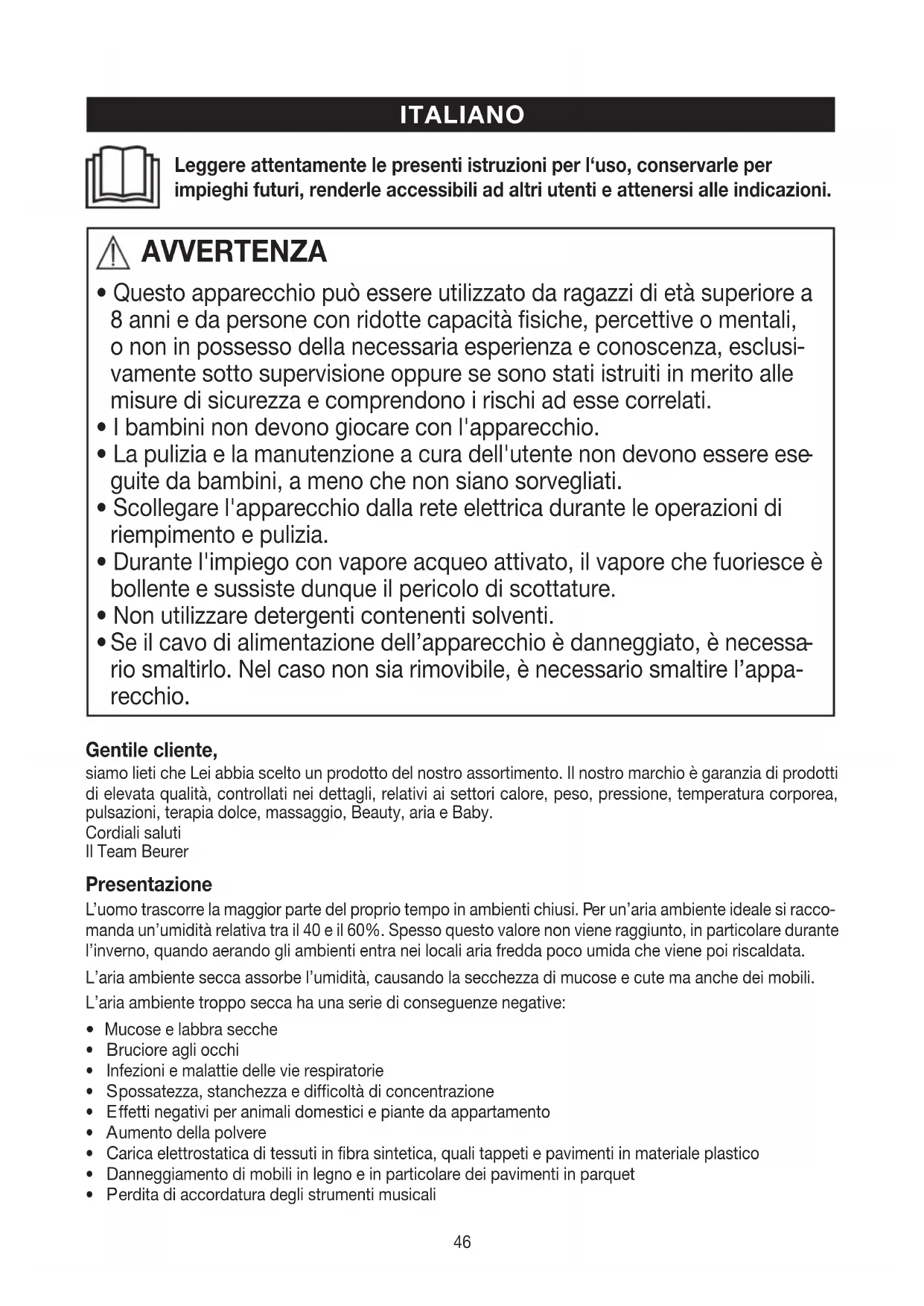 rio smaltirlo. Nel caso non sia rimovibile, è necessario smaltire l’appa- recchio. Gentile cliente, siamo lieti che Lei abbia scelto un prodotto del nostro assortimento. Il nostro marchio è garanzia di prodotti di elevata qualità, controllati nei dettagli, relativi ai settori calore, peso, pressione, temperatura corporea, pulsazioni, terapia dolce, massaggio, Beauty, aria e Baby. Cordiali saluti Il Team Beurer Presentazione L’uomo trascorre la maggior parte del proprio tempo in ambienti chiusi. Per un’aria ambiente ideale si racco- manda un’umidità relativa tra il 40 e il 60%. Spesso questo valore non viene raggiunto, in particolare durante l’inverno, quando aerando gli ambienti entra nei locali aria fredda poco umida che viene poi riscaldata. L’aria ambiente secca assorbe l’umidità, causando la secchezza di mucose e cute ma anche dei mobili. L’aria ambiente troppo secca ha una serie di conseguenze negative: