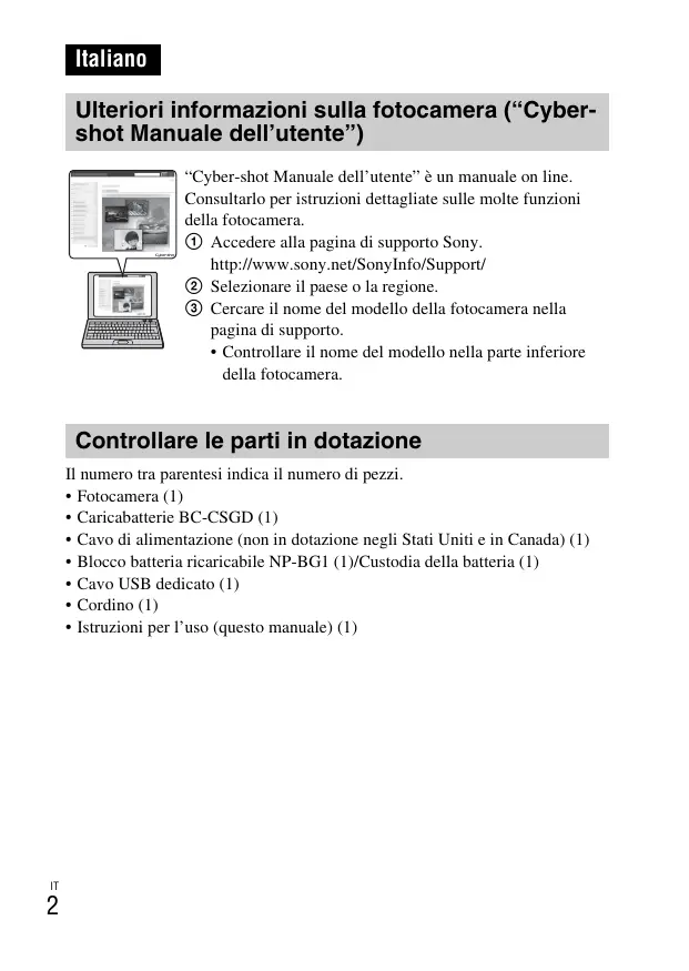 Italiano Ulteriori informazioni sulla fotocamera (“Cybershot Manuale dell’utente”) “Cyber-shot Manuale dell’utente” è un manuale on line. Consultarlo per istruzioni dettagliate sulle molte funzioni della fotocamera. 1 Accedere alla pagina di supporto Sony. http://www.sony.net/SonyInfo/Support/ 2 Selezionare il paese o la regione. 3 Cercare il nome del modello della fotocamera nella pagina di supporto.