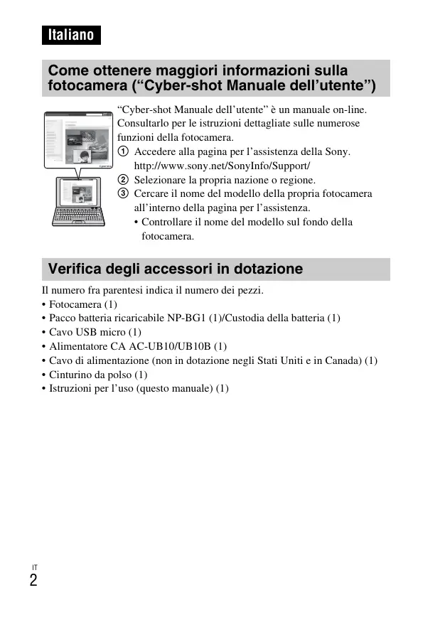 Italiano Come ottenere maggiori informazioni sulla fotocamera (“Cyber-shot Manuale dell’utente”) “Cyber-shot Manuale dell’utente” è un manuale on-line. Consultarlo per le istruzioni dettagliate sulle numerose funzioni della fotocamera. 1 Accedere alla pagina per l’assistenza della Sony. http://www.sony.net/SonyInfo/Support/ 2 Selezionare la propria nazione o regione. 3 Cercare il nome del modello della propria fotocamera all’interno della pagina per l’assistenza.