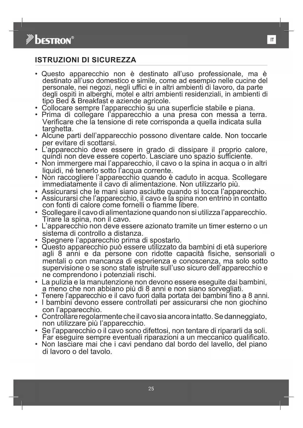 - Il tuo comune può dirti dove trovare il punto di raccolta dei riuti designato nel tuo quartiere. SERVIZIO Nell’improbabile eventualità che si verifichi un malfunzionamento, è possi- bile contattare il servizio di assistenza Bestron: www.bestron.com/service