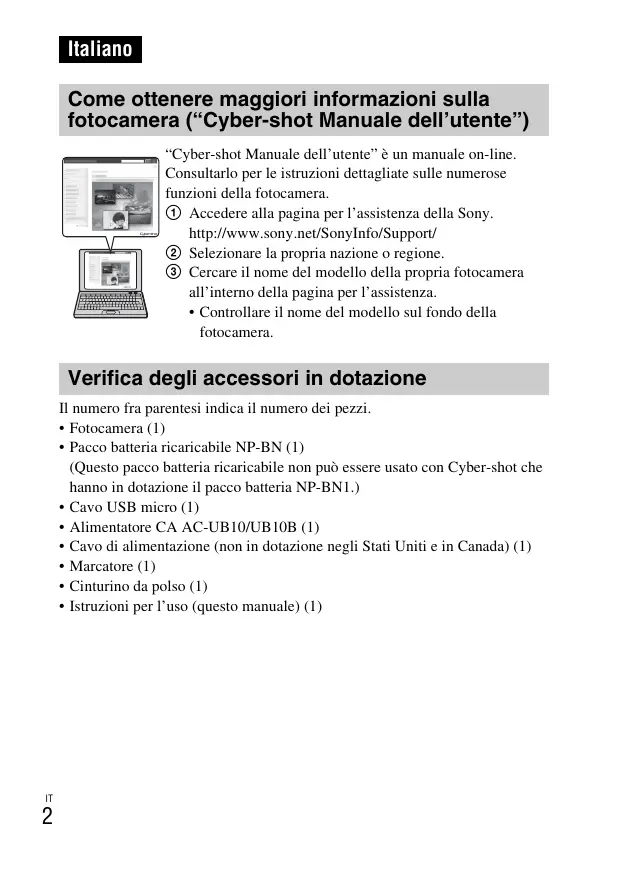 Italiano Come ottenere maggiori informazioni sulla fotocamera (“Cyber-shot Manuale dell’utente”) “Cyber-shot Manuale dell’utente” è un manuale on-line. Consultarlo per le istruzioni dettagliate sulle numerose funzioni della fotocamera. 1 Accedere alla pagina per l’assistenza della Sony. http://www.sony.net/SonyInfo/Support/ 2 Selezionare la propria nazione o regione. 3 Cercare il nome del modello della propria fotocamera all’interno della pagina per l’assistenza.