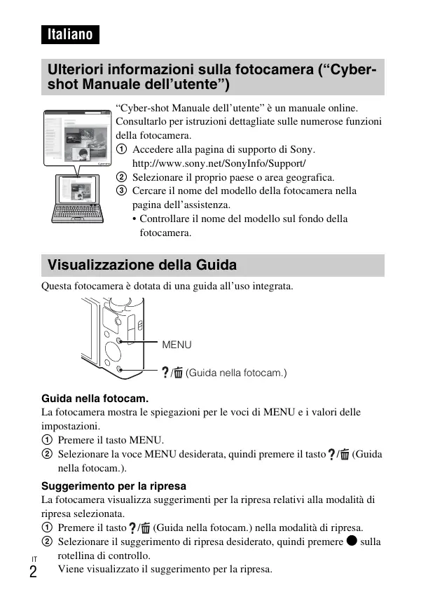 - Controllare il nome del modello sul fondo della fotocamera. Visualizzazione della Guida Questa fotocamera è dotata di una guida all’uso integrata. MENU