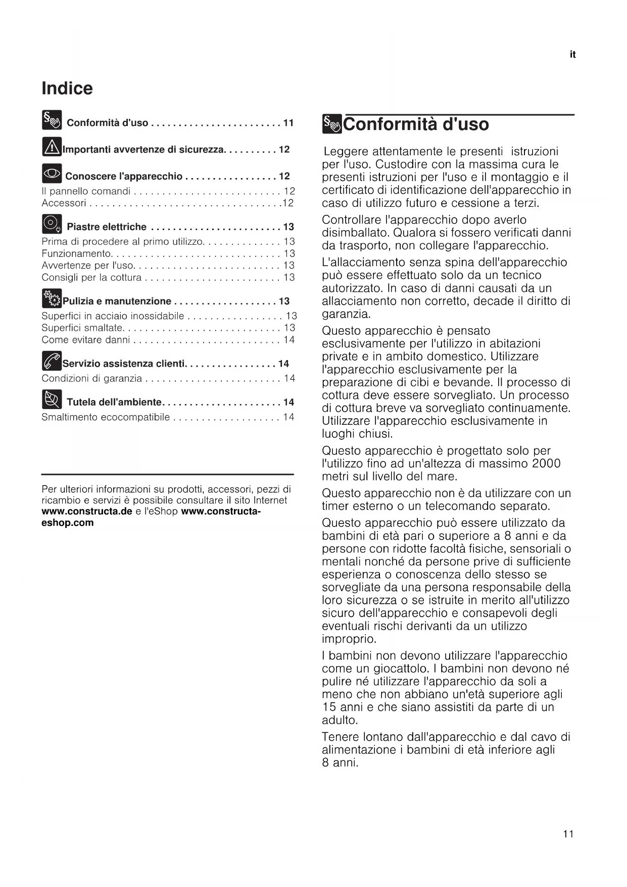- Conoscere l'apparecchio . . . . . . . . . . . . . . . . . 12 Il pannello comandi . . . . . . . . . . . . . . . . . . . . . . . . . . 12 Accessori . . . . . . . . . . . . . . . . . . . . . . . . . . . . . . . . . .12 ~ Piastre elettriche . . . . . . . . . . . . . . . . . . . . . . . . 13 Prima di procedere al primo utilizzo. . . . . . . . . . . . . . 13 Funzionamento. . . . . . . . . . . . . . . . . . . . . . . . . . . . . . 13 Avvertenze per l'uso. . . . . . . . . . . . . . . . . . . . . . . . . . 13 Consigli per la cottura . . . . . . . . . . . . . . . . . . . . . . . . 13 2 Pulizia e manutenzione . . . . . . . . . . . . . . . . . . . 13 Superfici in acciaio inossidabile . . . . . . . . . . . . . . . . . 13 Superfici smaltate. . . . . . . . . . . . . . . . . . . . . . . . . . . . 13 Come evitare danni . . . . . . . . . . . . . . . . . . . . . . . . . . 14 4 Servizio assistenza clienti. . . . . . . . . . . . . . . . . 14 Condizioni di garanzia . . . . . . . . . . . . . . . . . . . . . . . . 14 7 Tutela dell'ambiente. . . . . . . . . . . . . . . . . . . . . . 14 Smaltimento ecocompatibile . . . . . . . . . . . . . . . . . . . 14 Produktinfo Per ulteriori informazioni su prodotti, accessori, pezzi di ricambio e servizi è possibile consultare il sito Internet www.constructa.de e l'eShop www.constructa- eshop.com 8Conformità d'uso Co n f o r mità d' uso Leggere attentamente le presenti istruzioni per l'uso. Custodire con la massima cura le presenti istruzioni per l'uso e il montaggio e il certificato di identificazione dell'apparecchio in caso di utilizzo futuro e cessione a terzi. Controllare l'apparecchio dopo averlo disimballato. Qualora si fossero verificati danni da trasporto, non collegare l'apparecchio. L'allacciamento senza spina dell'apparecchio può essere effettuato solo da un tecnico autorizzato. In caso di danni causati da un allacciamento non corretto, decade il diritto di garanzia. Questo apparecchio è pensato esclusivamente per l'utilizzo in abitazioni private e in ambito domestico. Utilizzare l'apparecchio esclusivamente per la preparazione di cibi e bevande. Il processo di cottura deve essere sorvegliato. Un processo di cottura breve va sorvegliato continuamente. Utilizzare l'apparecchio esclusivamente in luoghi chiusi. Questo apparecchio è progettato solo per l'utilizzo fino ad un'altezza di massimo 2000 metri sul livello del mare. Questo apparecchio non è da utilizzare con un timer esterno o un telecomando separato. Questo apparecchio può essere utilizzato da bambini di età pari o superiore a 8 anni e da persone con ridotte facoltà fisiche, sensoriali o mentali nonché da persone prive di sufficiente esperienza o conoscenza dello stesso se sorvegliate da una persona responsabile della loro sicurezza o se istruite in merito all'utilizzo sicuro dell'apparecchio e consapevoli degli eventuali rischi derivanti da un utilizzo improprio. I bambini non devono utilizzare l'apparecchio come un giocattolo. I bambini non devono né pulire né utilizzare l'apparecchio da soli a meno che non abbiano un'età superiore agli 15 anni e che siano assistiti da parte di un adulto. Tenere lontano dall'apparecchio e dal cavo di alimentazione i bambini di età inferiore agli 8 anni.it Importanti avvertenze di sicurezza
