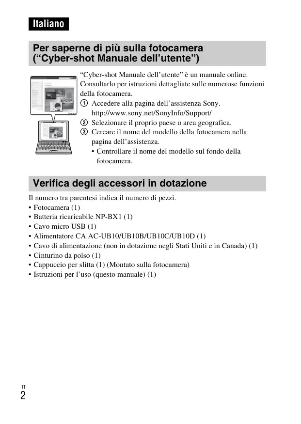 Italiano Per saperne di più sulla fotocamera (“Cyber-shot Manuale dell’utente”) “Cyber-shot Manuale dell’utente” è un manuale online. Consultarlo per istruzioni dettagliate sulle numerose funzioni della fotocamera. 1 Accedere alla pagina dell’assistenza Sony. http://www.sony.net/SonyInfo/Support/ 2 Selezionare il proprio paese o area geografica. 3 Cercare il nome del modello della fotocamera nella pagina dell’assistenza.
