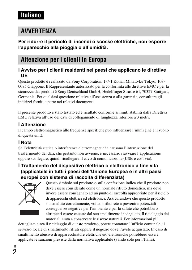 Italiano AVVERTENZA Per ridurre il pericolo di incendi o scosse elettriche, non esporre l’apparecchio alla pioggia o all’umidità. Attenzione per i clienti in Europa [ Avviso per i clienti residenti nei paesi che applicano le direttive Questo prodotto è realizzato da Sony Corporation, 1-7-1 Konan Minato-ku Tokyo, 1080075 Giappone. Il Rappresentante autorizzato per la conformità alle direttive EMC e per la sicurezza dei prodotti è Sony Deutschland GmbH, Hedelfinger Strasse 61, 70327 Stuttgart, Germania. Per qualsiasi questione relativa all’assistenza o alla garanzia, consultare gli indirizzi forniti a parte nei relativi documenti. Il presente prodotto è stato testato ed è risultato conforme ai limiti stabiliti dalla Direttiva EMC relativa all’uso dei cavi di collegamento di lunghezza inferiore a 3 metri. [ Attenzione Il campo elettromagnetico alle frequenze specifiche può influenzare l’immagine e il suono di questa unità. [ Nota Se l’elettricità statica o interferenze elettromagnetiche causano l’interruzione del trasferimento dei dati, che pertanto non avviene, è necessario riavviare l’applicazione oppure scollegare, quindi ricollegare il cavo di comunicazione (USB e così via). [ Trattamento del dispositivo elettrico o elettronico a fine vita (applicabile in tutti i paesi dell’Unione Europea e in altri paesi europei con sistema di raccolta differenziata) Questo simbolo sul prodotto o sulla confezione indica che il prodotto non deve essere considerato come un normale rifiuto domestico, ma deve invece essere consegnato ad un punto di raccolta appropriato per il riciclo di apparecchi elettrici ed elettronici. Assicurandovi che questo prodotto sia smaltito correttamente, voi contribuirete a prevenire potenziali conseguenze negative per l’ambiente e per la salute che potrebbero altrimenti essere causate dal suo smaltimento inadeguato. Il riciclaggio dei materiali aiuta a conservare le risorse naturali. Per informazioni più dettagliate circa il riciclaggio di questo prodotto, potete contattare l’ufficio comunale, il servizio locale di smaltimento rifiuti oppure il negozio dove l’avete acquistato. In caso di smaltimento abusivo di apparecchiature elettriche e/o elettroniche potrebbero essere applicate le sanzioni previste dalla normativa applicabile (valido solo per l’Italia).