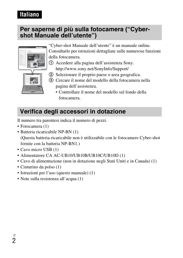 Italiano Per saperne di più sulla fotocamera (“Cybershot Manuale dell’utente”) “Cyber-shot Manuale dell’utente” è un manuale online. Consultarlo per istruzioni dettagliate sulle numerose funzioni della fotocamera. 1 Accedere alla pagina dell’assistenza Sony. http://www.sony.net/SonyInfo/Support/ 2 Selezionare il proprio paese o area geografica. 3 Cercare il nome del modello della fotocamera nella pagina dell’assistenza.