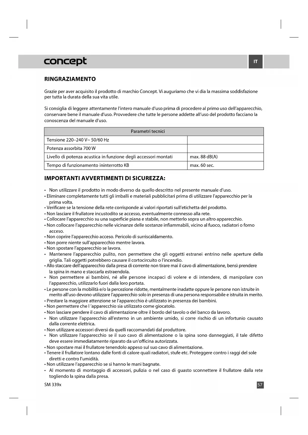 RINGRAZIAMENTO Grazie per aver acquisito il prodotto di marchio Concept. Vi auguriamo che vi dia la massima soddisfazione per tutta la durata della sua vita utile. Si consiglia di leggere attentamente l’intero manuale d’uso prima di procedere al primo uso dell’apparecchio, conservare bene il manuale d’uso. Provvedere che tutte le persone addette all’uso del prodotto facciano la conoscenza del manuale d’uso. Parametri tecnici Tensione 220–240 V~ 50/60 Hz Potenza assorbita 700 W Livello di potenza acustica in funzione degli accessori montati max. 88 dB(A) Tempo di funzionamento ininterrotto KB max. 60 sec. IMPORTANTI AVVERTIMENTI DI SICUREZZA:
