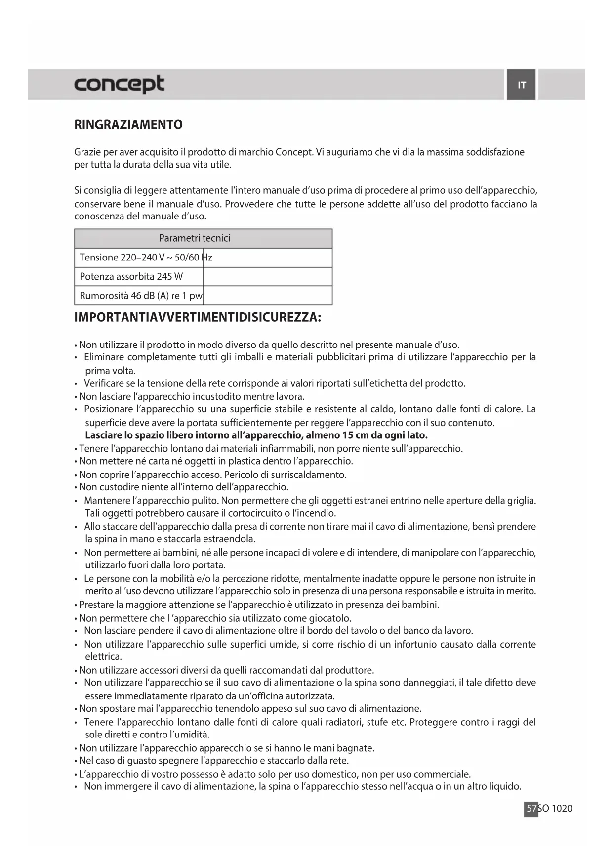- I sacchetti in polietilene (PE) possono essere recuperati come rifiuto differenziato. Riciclaggio del prodotto alla fine della sua vita utile Il simbolo riportato sul prodotto o sul suo imballo indica che il prodotto stesso non deve essere smaltito come rifiuto urbano. Va portato in un centro di raccolta dei rifiuti elettrici ed elettronici. Provvedendo allo smaltimento corretto del prodotto si può prevenire l’impatto negativo sull’ambiente e/o sulla salute umana nel caso di mancato riciclaggio. Le maggiori informazioni sulle modalità dello smaltimento del prodotto sono reperibili presso l’ufficio locale di amministrazione pubblica oppure nel negozio dove il prodotto è stato acquisito. Il presente prodotto rispetta tutti i requisiti previsti dalle normative UE. Il produttore si riserva il diritto di modificare senza preavviso il testo del manuale d’uso, il design del prodotto e/o i suoi parametri tecnici. 61SO 1020 ITAGRADECIMIENTO Gracias por comprar este producto de la marca Concept y esperamos que quede satisfecho con él durante todo el tiempo que lo use. Antes de usar el producto, lea con cuidado todo el manual y luego guárdelo. Asegúrese de que las demás personas que vayan a utilizar el producto se familiaricen con el presente manual. Parámetros técnicos Tensión 220–240 V ~ 50/60 Hz Potencia de entrada 245 W Nivel de ruido 46 dB (A) re 1 pw ADVERTENCIAS IMPORTANTES DE SEGURIDAD: