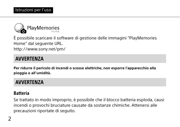 Istruzioni per l’uso È possibile scaricare il software di gestione delle immagini “PlayMemories Home” dal seguente URL. http://www.sony.net/pm/ AVVERTENZA Per ridurre il pericolo di incendi o scosse elettriche, non esporre l’apparecchio alla pioggia o all’umidità. AVVERTENZA Batteria Se trattato in modo improprio, è possibile che il blocco batteria esploda, causi incendi o provochi bruciature causate da sostanze chimiche. Attenersi alle precauzioni riportate di seguito.