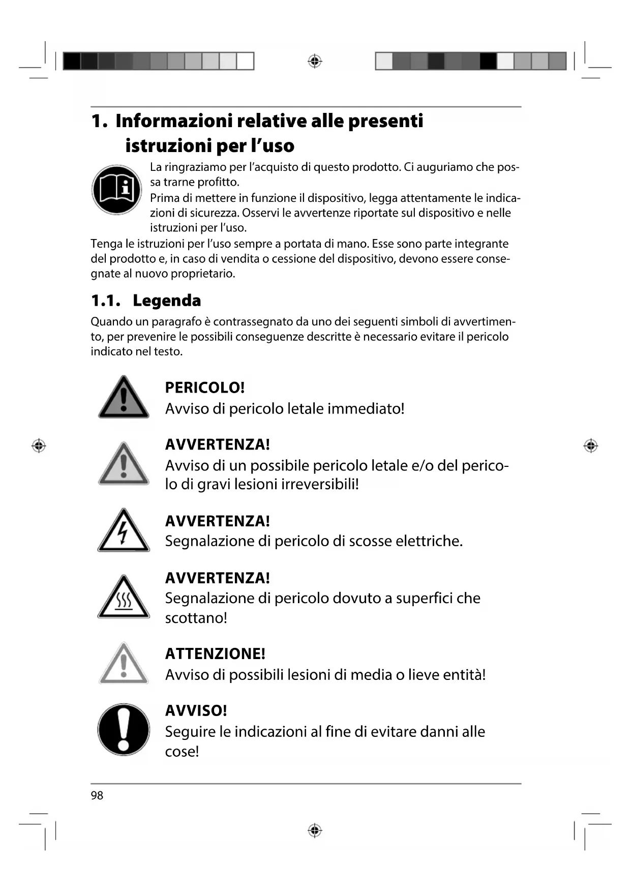 1. Informazioni relative alle presenti istruzioni per l’uso .......................... 98
