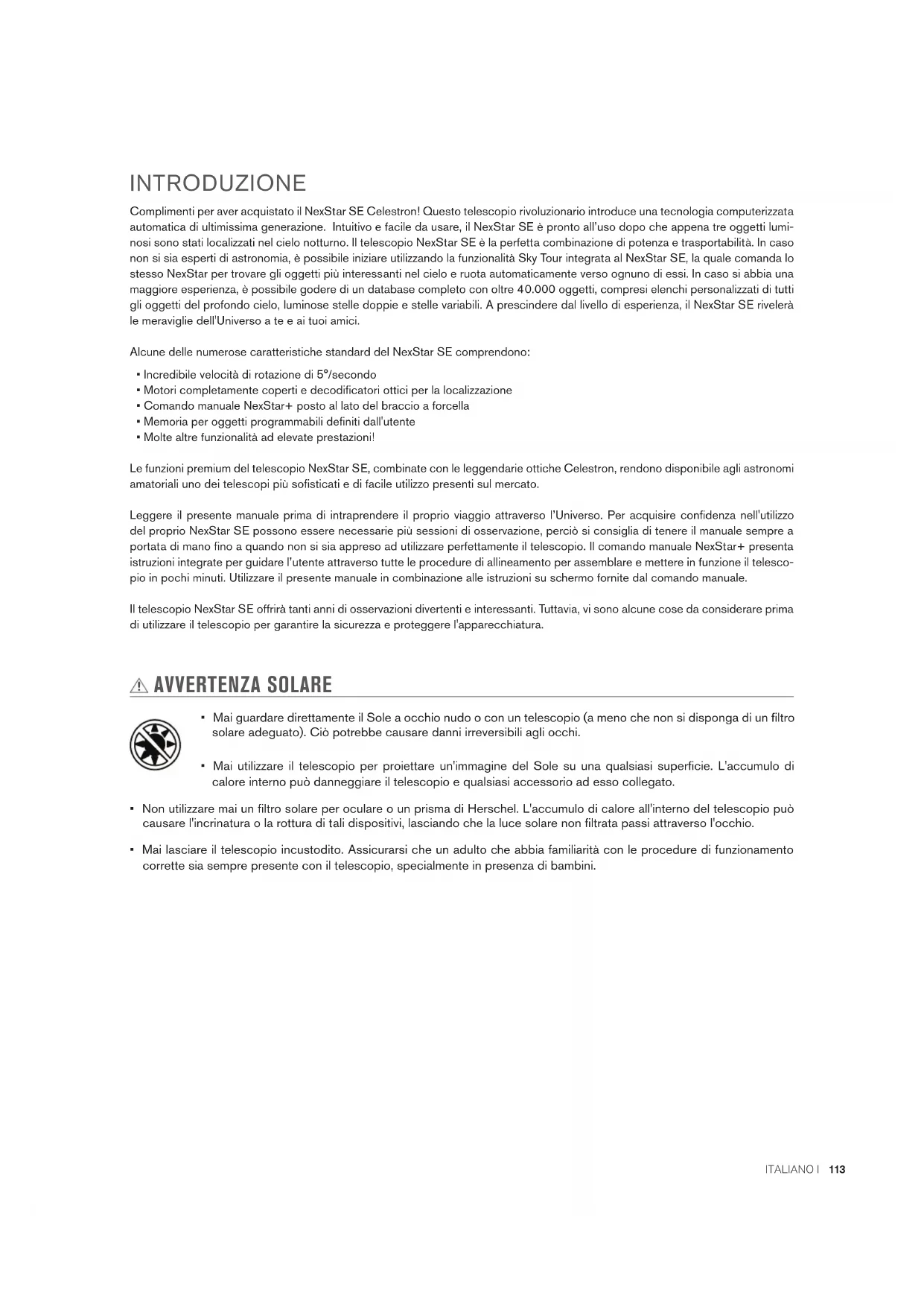 - Molte altre funzionalità ad elevate prestazioni! Le funzioni premium del telescopio NexStar SE, combinate con le leggendarie ottiche Celestron, rendono disponibile agli astronomi amatoriali uno dei telescopi più sofisticati e di facile utilizzo presenti sul mercato. Leggere il presente manuale prima di intraprendere il proprio viaggio attraverso l’Universo. Per acquisire confidenza nell'utilizzo del proprio NexStar SE possono essere necessarie più sessioni di osservazione, perciò si consiglia di tenere il manuale sempre a portata di mano fino a quando non si sia appreso ad utilizzare perfettamente il telescopio. Il comando manuale NexStar+ presenta istruzioni integrate per guidare l’utente attraverso tutte le procedure di allineamento per assemblare e mettere in funzione il telesco- pio in pochi minuti. Utilizzare il presente manuale in combinazione alle istruzioni su schermo fornite dal comando manuale. Il telescopio NexStar SE offrirà tanti anni di osservazioni divertenti e interessanti. Tuttavia, vi sono alcune cose da considerare prima di utilizzare il telescopio per garantire la sicurezza e proteggere l'apparecchiatura. INTRODUZIONE AVVERTENZA SOLARE