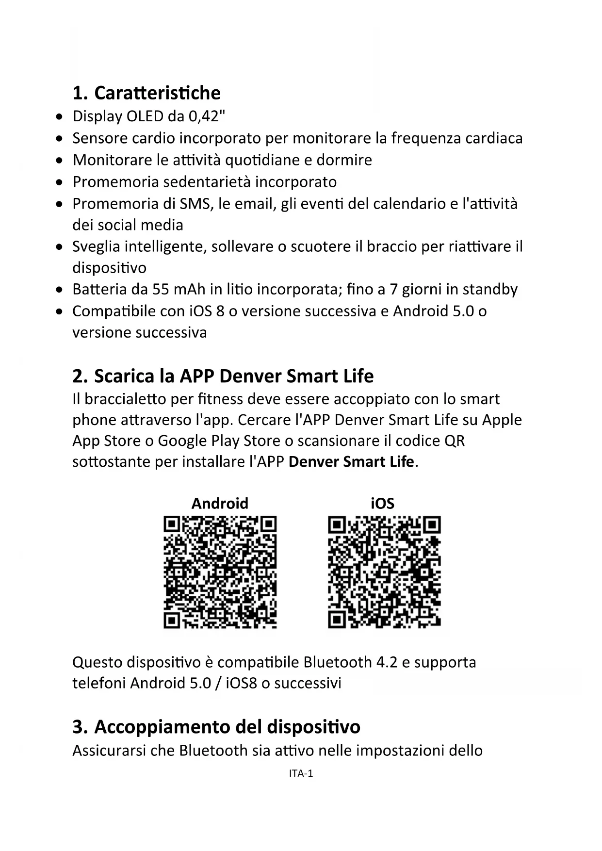 Il braccialetto per fitness deve essere accoppiato con lo smart phone attraverso l'app. Cercare l'APP Denver Smart Life su Apple App Store o Google Play Store o scansionare il codice QR sottostante per installare l'APP Denver Smart Life. Android iOS