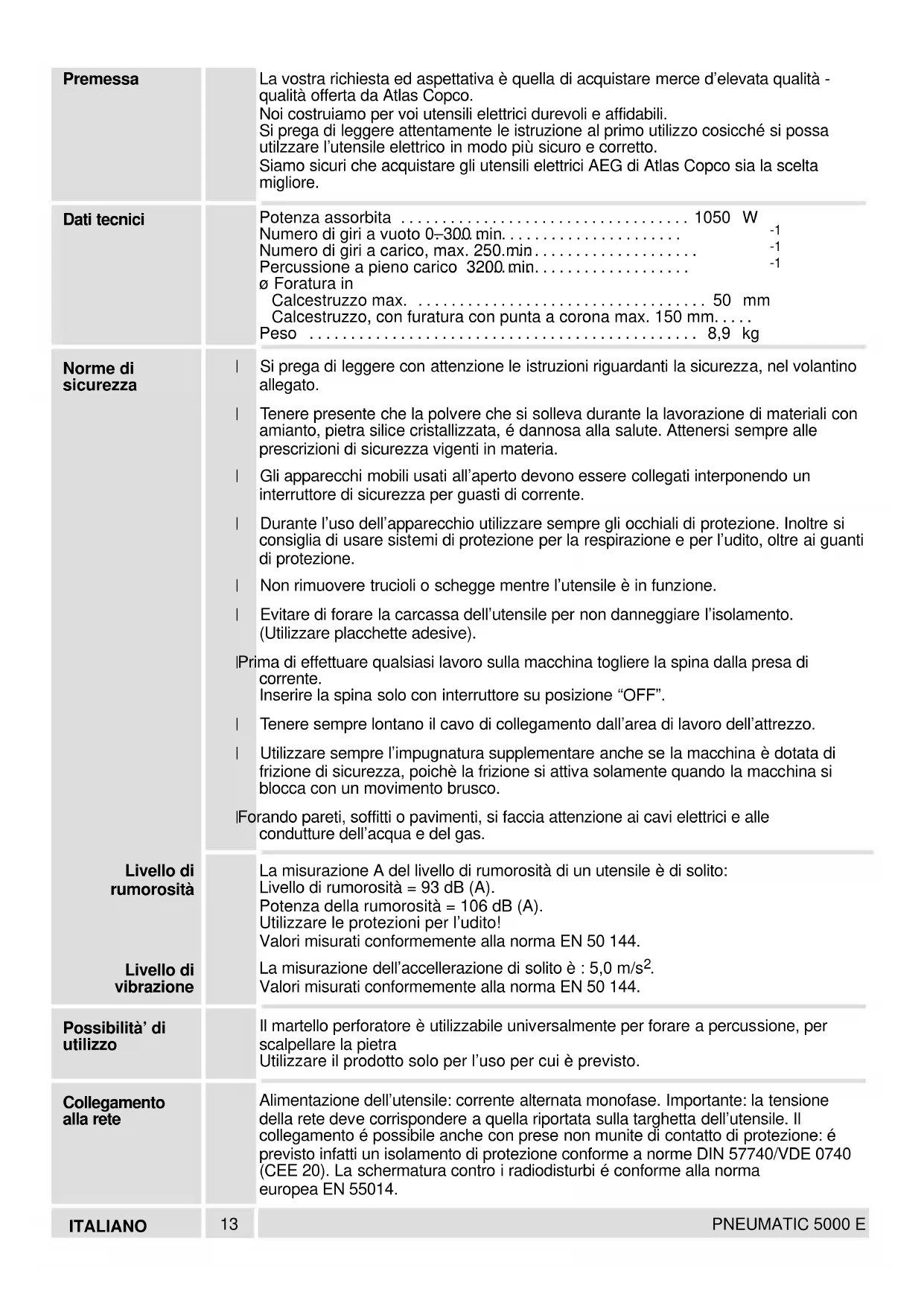 Valori misurati conformemente alla norma EN 50 144. Il martello perforatore è utilizzabile universalmente per forare a percussione, per scalpellare la pietra Utilizzare il prodotto solo per l’uso per cui è previsto. Alimentazione dell’utensile: corrente alternata monofase. Importante: la tensione della rete deve corrispondere a quella riportata sulla targhetta dell’utensile. Il collegamento é possibile anche con prese non munite di contatto di protezione: é previsto infatti un isolamento di protezione conforme a norme DIN 57740/VDE 0740 (CEE 20). La schermatura contro i radiodisturbi é conforme alla norma europea EN 55014. Premessa Dati tecnici Norme di sicurezza Livello di rumorosità Livello di vibrazione Possibilità’ di utilizzo Collegamento alla rete14 ITALIANO PNEUMATIC 5000 E Il meccanismo pnematico di percussione assicura la potenza del colpo necessaria per forare anche la pietra. Il contropercussore all’interno dell’utensile batte direttamente sullo scalpello che si muove assialmente, come farebbe un martello guidato dalla mano dell’uomo. Il motore elettrico muove, attraverso un meccanismo oscillante ––> pistone ––> pistone libero, il contropercussore avanti e indietro. Tra pistone e pistone libero è presente un cuscino d’aria (quindi: dispositivo di percussione pneumatico) In questo modo, è garantita una notevole qualità di foratura senza contraccolpi. La potenza di foratura non dipende dalla pressione esercitata. Accendere: premere l’interruttore principale Spegnere: rilasciare l’interruttore principale. E’ possibile regolare il numero di giri in maniera continua premendo l’interruttore principale. Funzionamento del martello pneumatico Breve indicazione Accensione– Spegnimento Frizione di sicurezza integrata per evitare che l’utensile ruoti in caso di blocco della punta. Carcassa di forma ergonomica con soft–grip per lavori senza vibrazioni. IL Sistema Anti Vibrazioni AVS La carcassa ingranaggi – motore è separata dall’impugnatura; gli elementi ammotizzanti assorbono le vibrazioni provocate durante la perforazione e la scalpellatura. Levetta di commutazione per selezionare: foratura a percussione o scalpellare Impughatura laterale regolabile con limitatore di profondità integrato. Interruttore principale a grilletto per accendere e spegnere l’utensile e per un’accelerazione elettronica continua. Attacco per impugnatura supplementare a lato della macchina. Per perforare verso l’alto e verso il basso, l’impugnatura puo essere posizionata lateralmente alla macchina. Modifiche: Testo, figure e dati corrispondono allo standard tecnico aggiornato all’epoca della stampa. Ci riserviamo pertanto eventuali modifiche tecniche dovute all’ulteriore sviluppo dei nostri prodotti. Mandrino per punte a martello per utensili con attacco SDS–max – Gli utensili si fissano automaticamente una volta montati.15 ITALIANO PNEUMATIC 5000 E Prima di effettuare qualsiasi lavoro sulla macchina togliere la spina dalla presa di corrente. Nel mandrino per punte da martello possono essere inseriti i seguenti utensili con attacco SDS-max: - punte da martello per forare il calcestruzzo e la pietra. - scalpelli a punta, scalpelli piatti, scalpelli per il legno. Utilizzare solo utensili con gambo SDS-max!